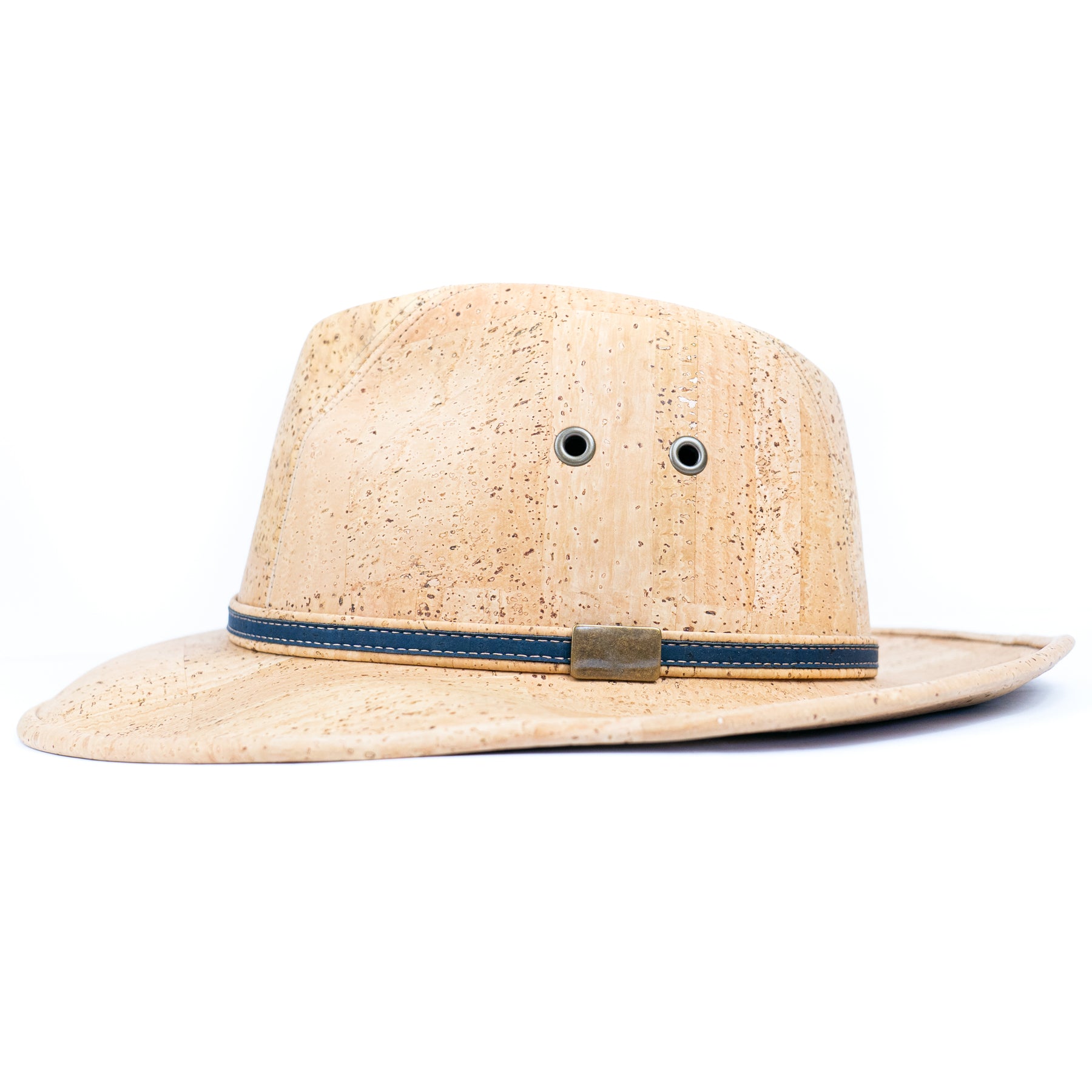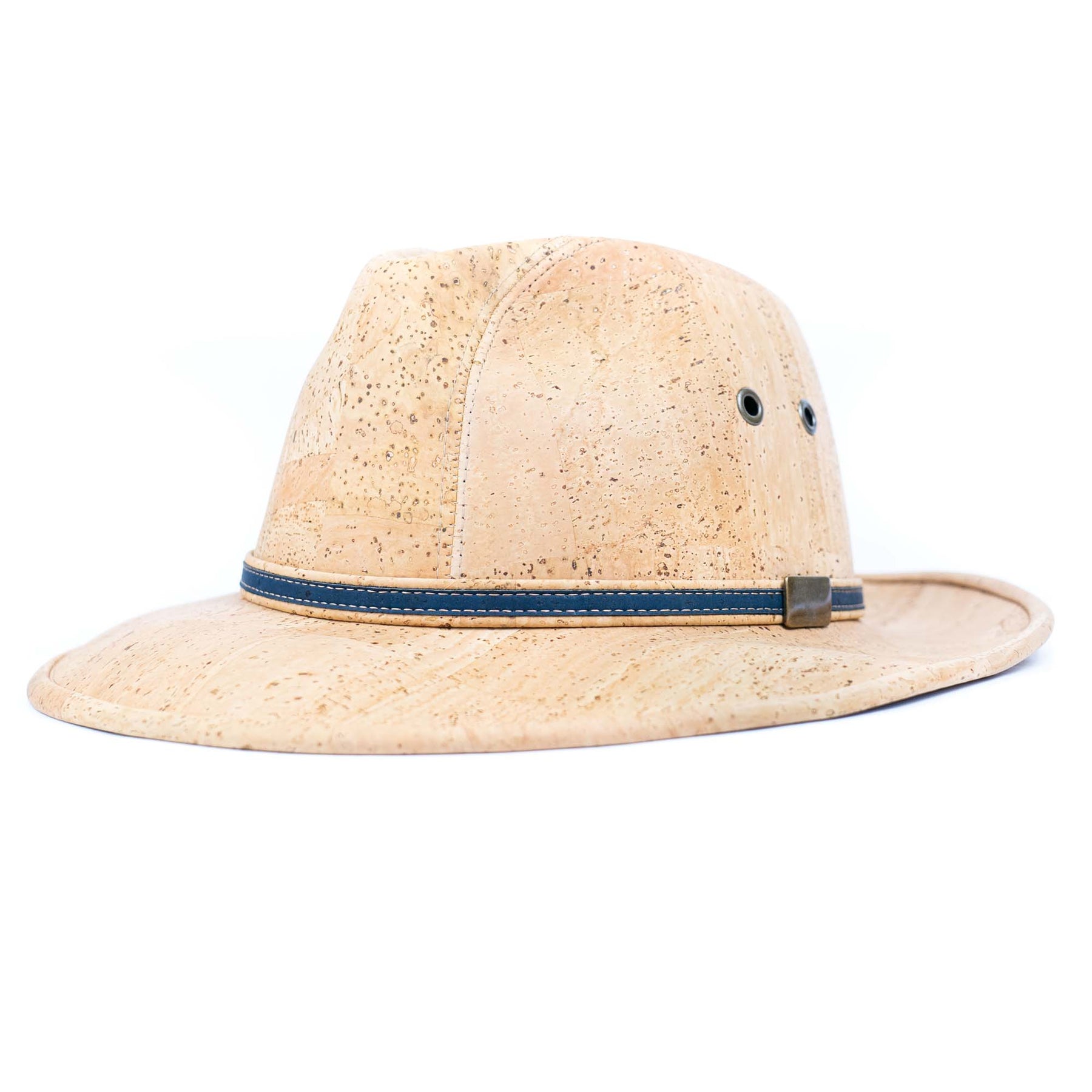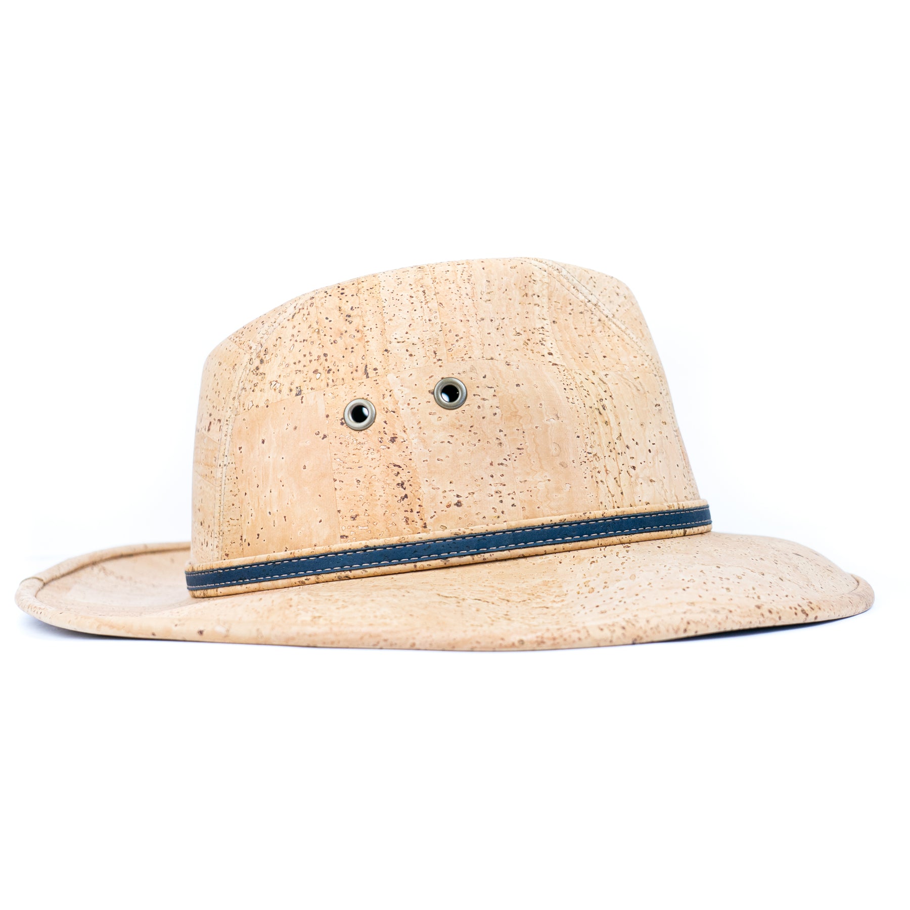 A lightweight safari-style hat crafted from soft, flexible cork fabric and finished with a clean contrast trim. This design includes side ventilation eyelets for airflow and a slim decorative band that adds a refined touch. Comfortable, water-resistant, and perfect for sunny days.