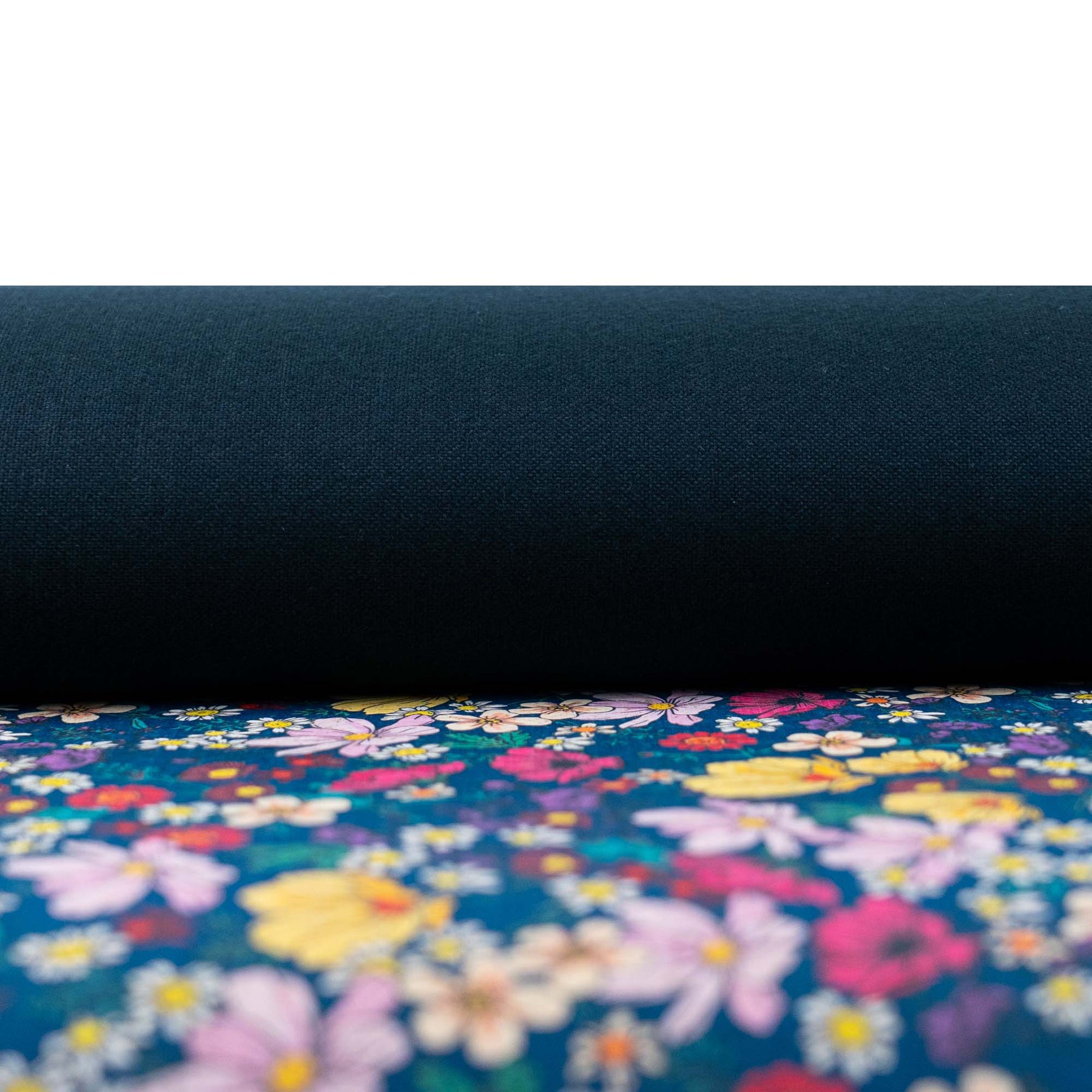 Add a touch of vibrant elegance to your creations with this dark blue floral cork fabric, featuring a stunning mix of yellow, pink, red, and white wildflowers on a deep blue background. The vivid floral pattern brings life and color to any handmade project, making it perfect for both classic and contemporary designs.