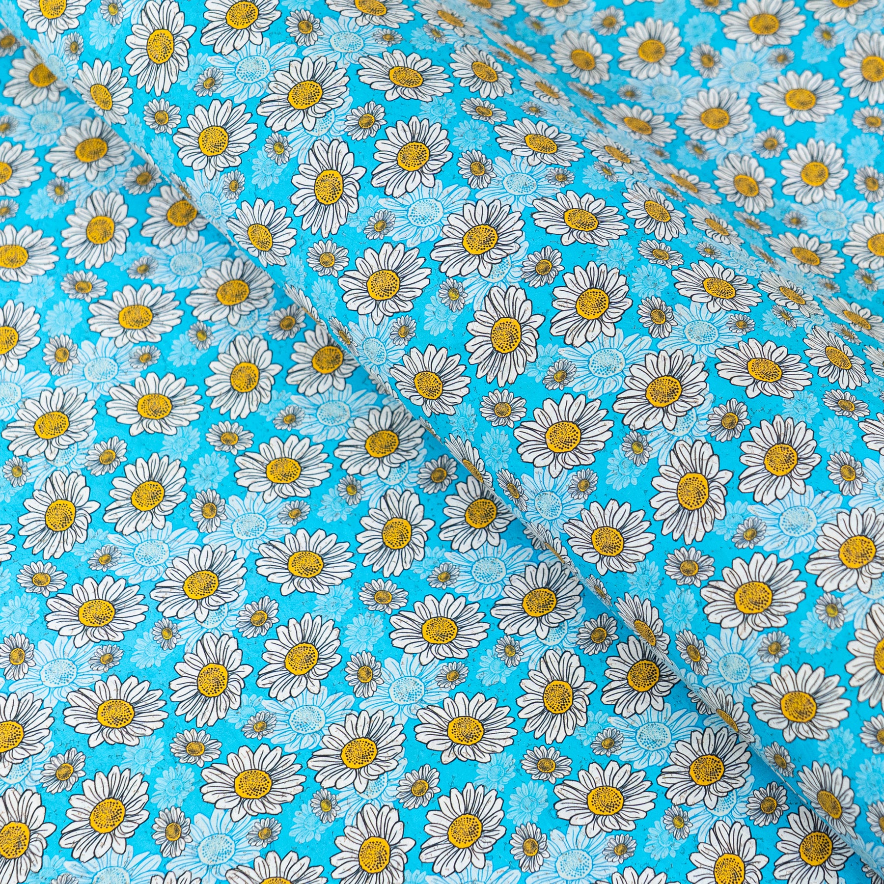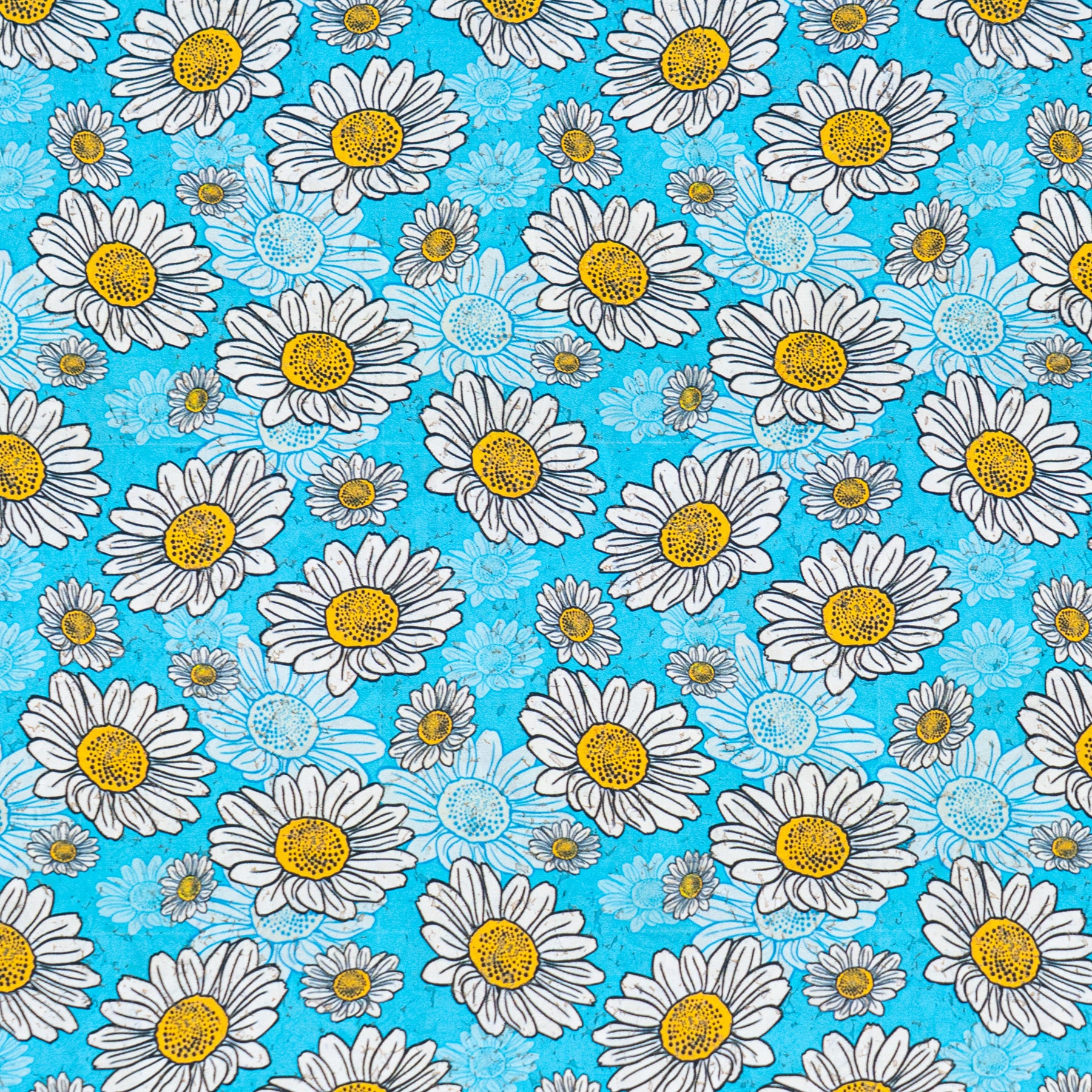 Bring a touch of sunshine to your creations with this blue daisy cork fabric, featuring a lively pattern of white and yellow daisies on a bright sky-blue background. The vibrant floral design adds a cheerful and fresh look, perfect for spring and summer-inspired handmade pieces.