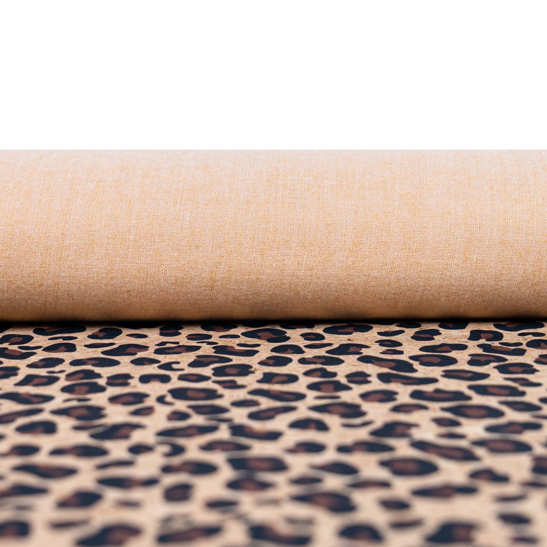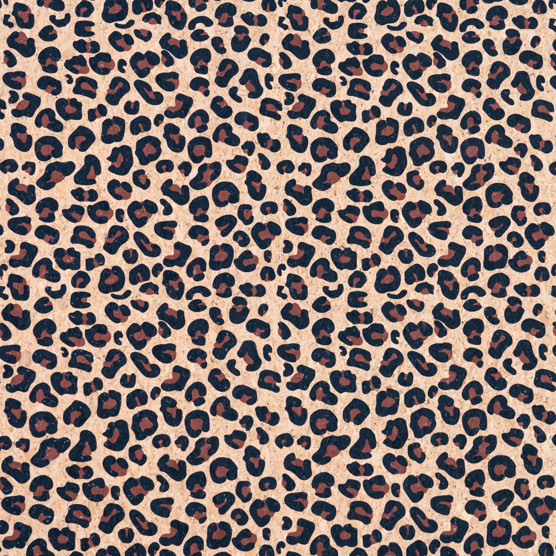 This stylish cork fabric features a classic leopard print pattern in black and warm brown tones on a natural cork background. The design combines a timeless animal motif with the organic texture of real cork, creating a bold yet natural look.