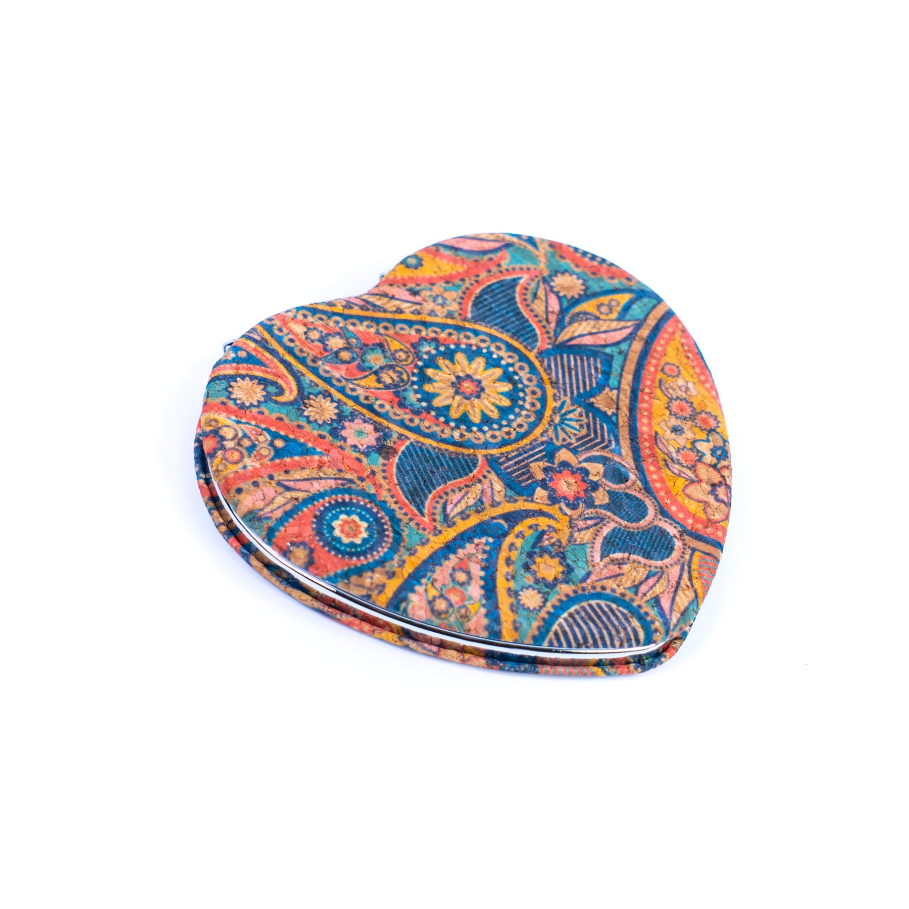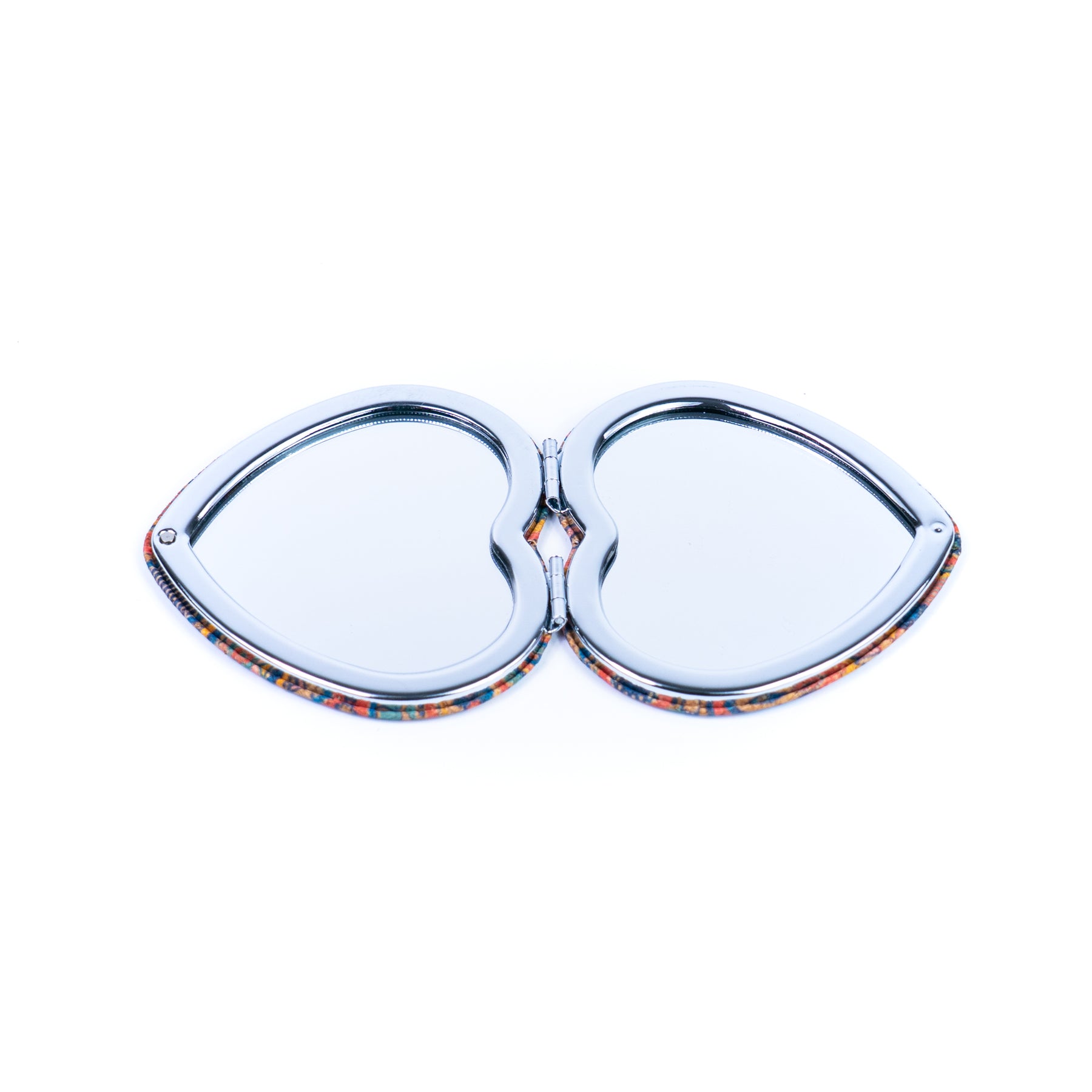 This heart-shaped cork compact mirror features colorful assorted patterns with a unique artistic touch. Made from natural cork, it is lightweight, eco-friendly, and pleasant to hold.