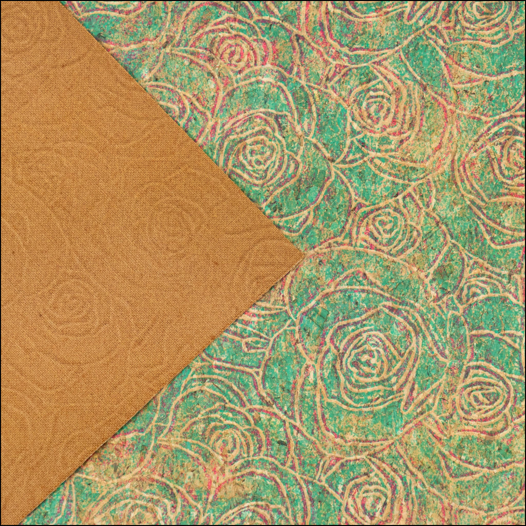 This embossed cork fabric features an elegant rose pattern, highlighted with soft green, pink, and beige tones. The pressed embossing creates a textured floral surface, adding depth and a refined look to the material.