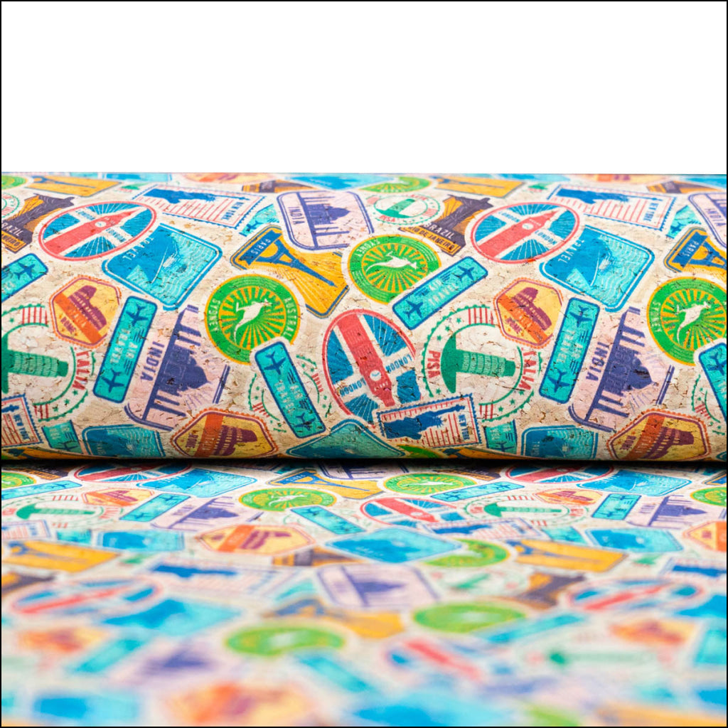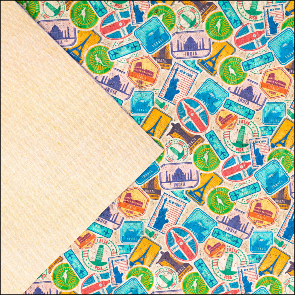 World Famous Landmarks Stamp and Passport Seal Pattern on Cork Fabric COF-502