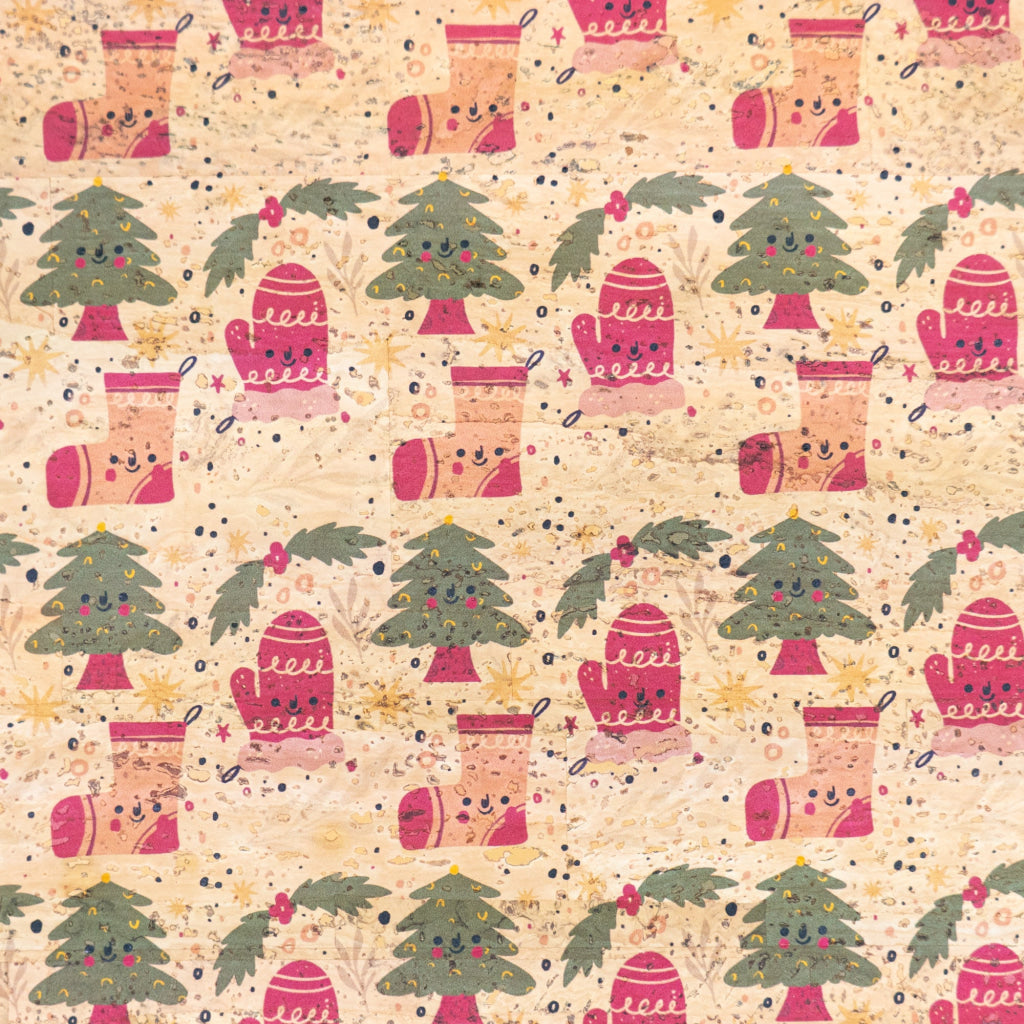 Holiday Special - Cozy Mittens Stockings & Trees on Natural Cork Fabric COF-10 1/2M (138*50 cm / 54*19 inches) cork
