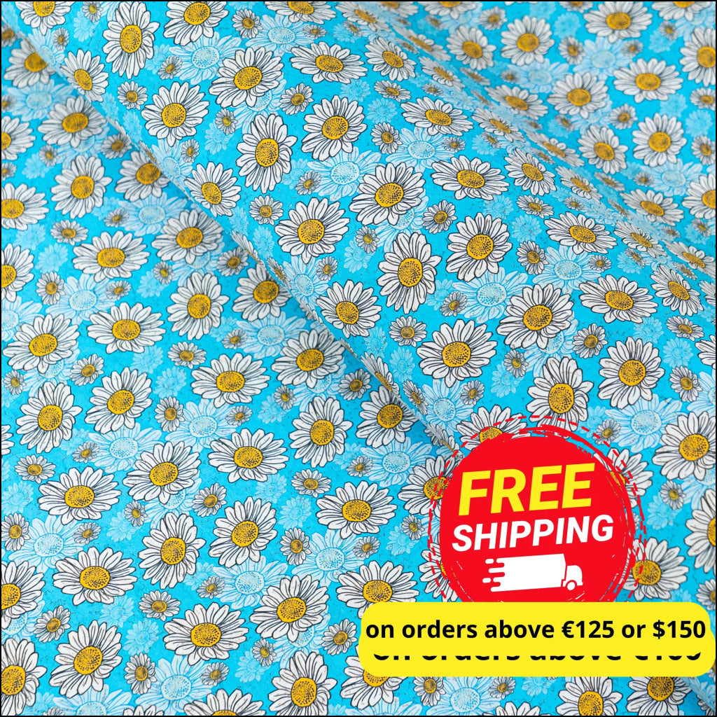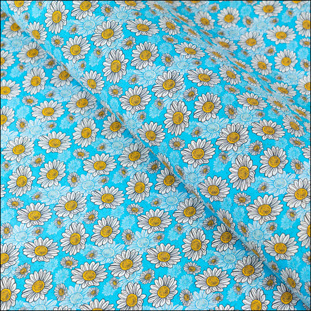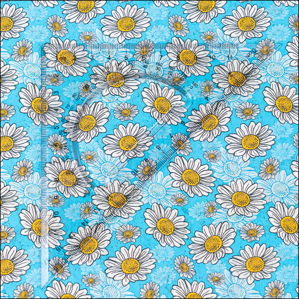 Bring a touch of sunshine to your creations with this blue daisy cork fabric, featuring a lively pattern of white and yellow daisies on a bright sky-blue background. The vibrant floral design adds a cheerful and fresh look, perfect for spring and summer-inspired handmade pieces.