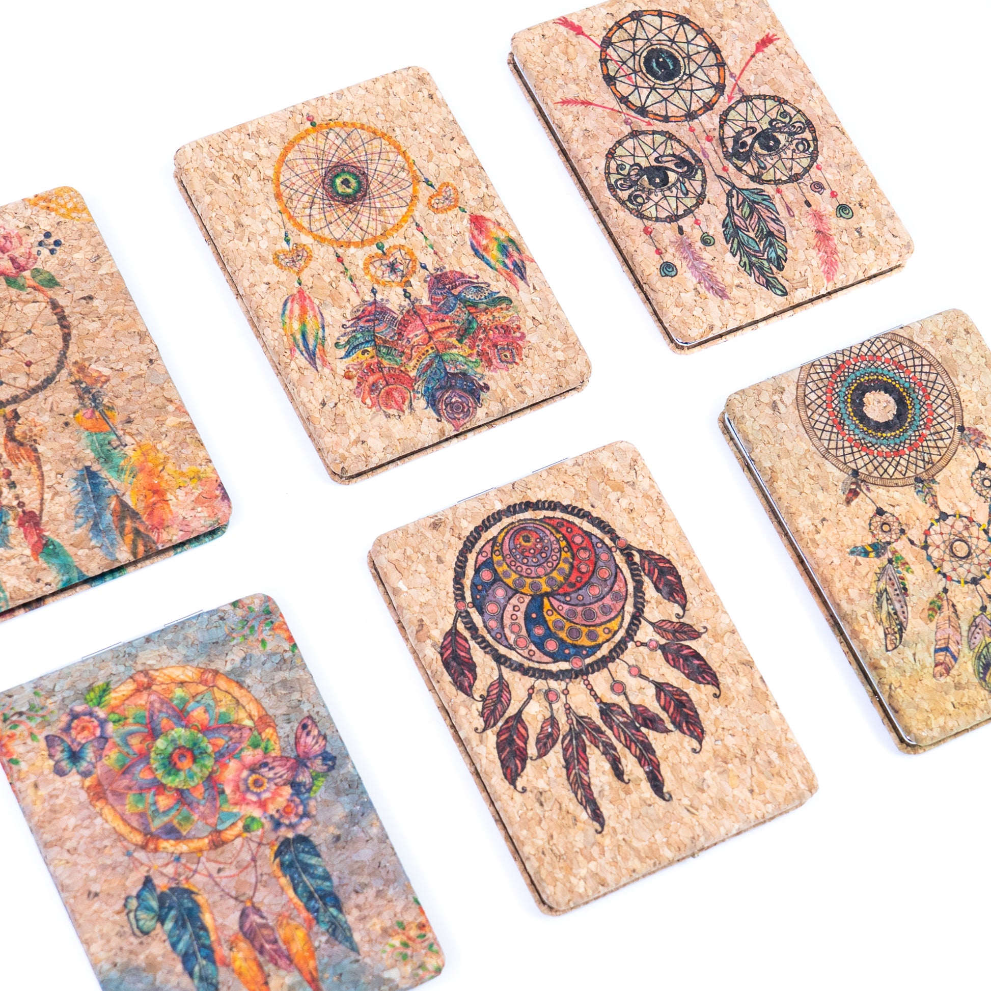 This rectangular cork compact mirror features colorful dreamcatcher designs with a bohemian artistic style. Made from natural cork, it is lightweight, eco-friendly, and comfortable to hold.