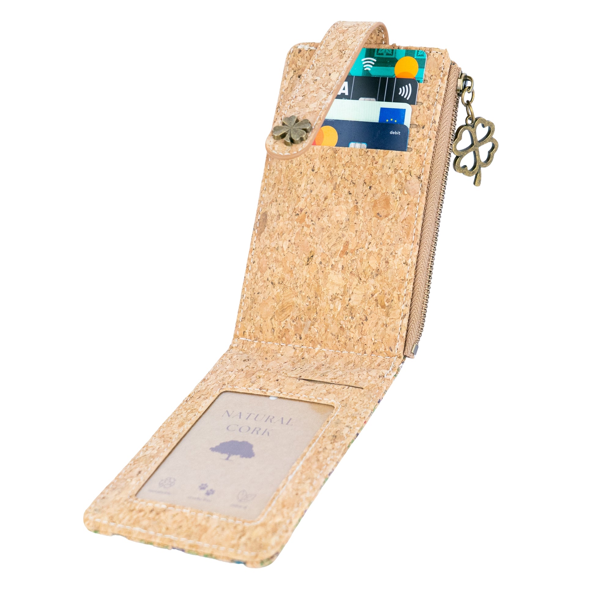 Multiple card slots, a clear ID window, and a zippered pocket for coins or keys