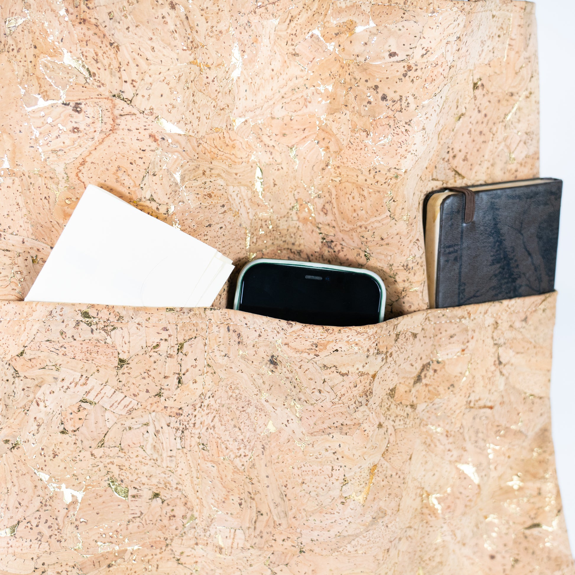 Natural cork tote bag with gold flecks and three front pockets. Minimalist elegance meets everyday practicality.