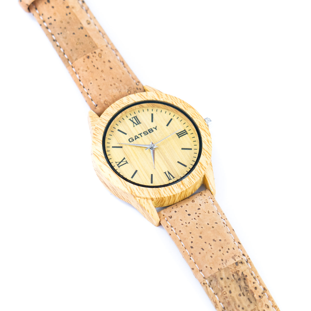 Unisex stylish cork watch with Roman numerals and warm wood grain dial WA-456