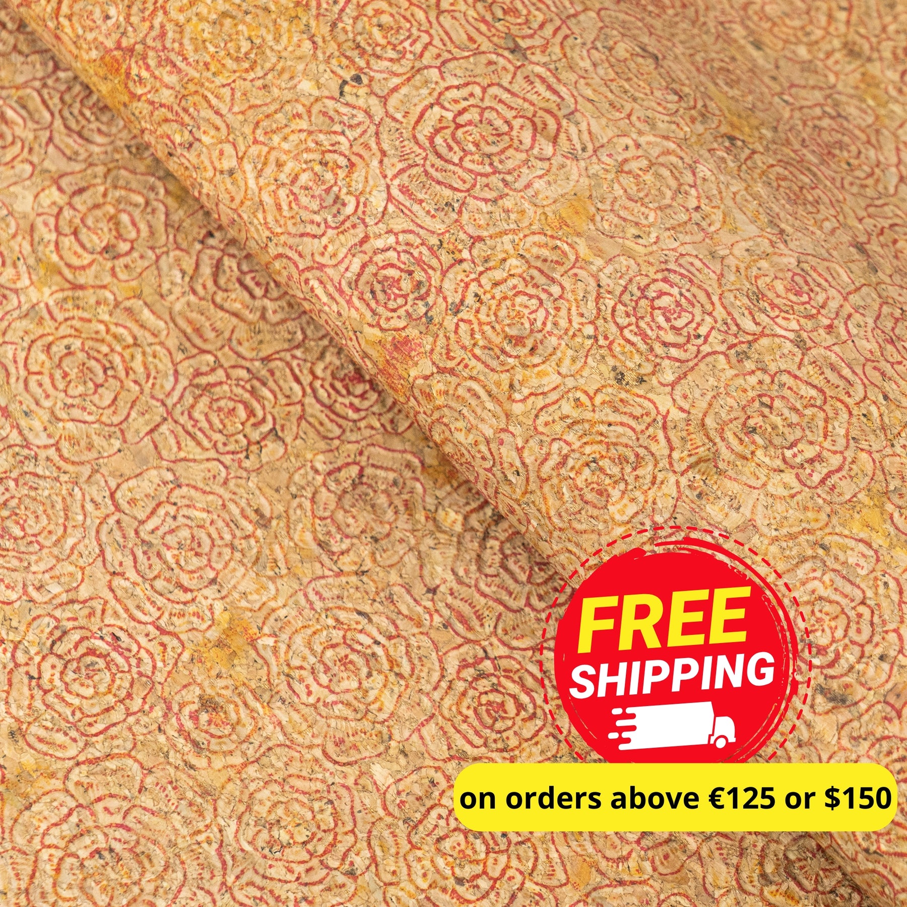 Embossed Rose Pattern Cork Fabric Beige & Red Tones COF-643 cork fabric