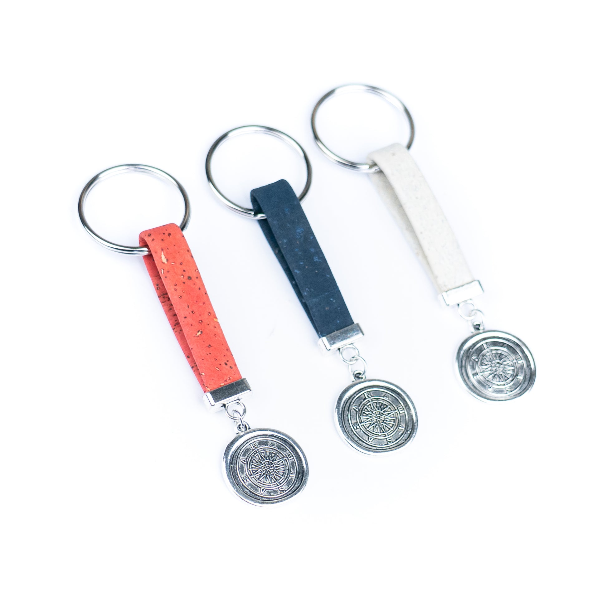 Handmade Cork Keychains – Compass Medallion Charm (Set of 10 Colors · Alloy Hardware)
