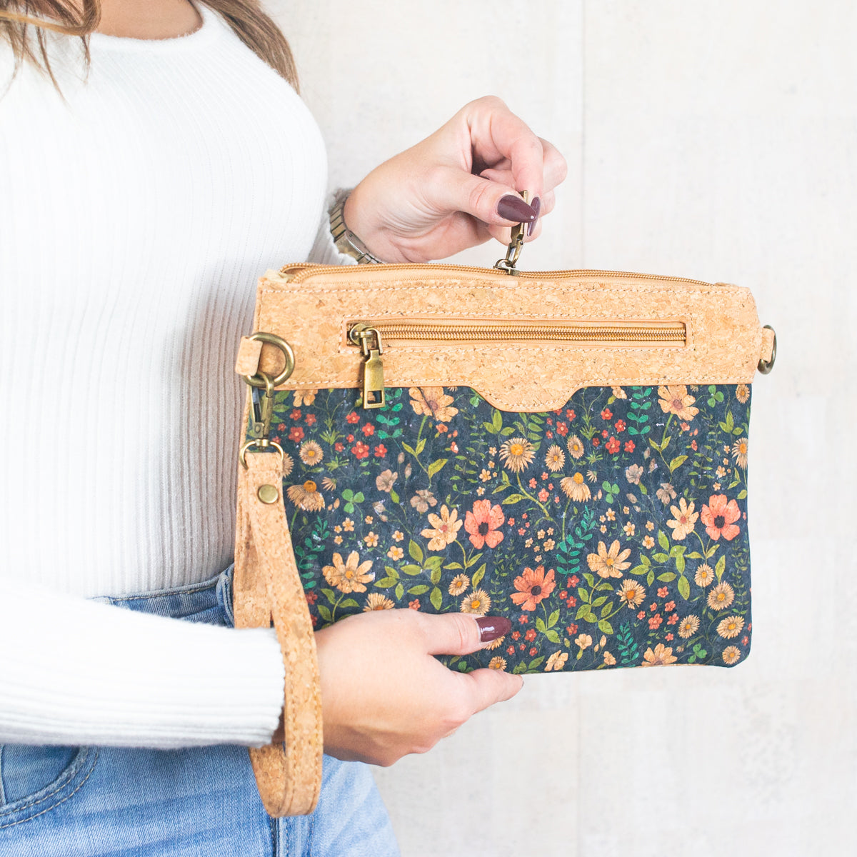 this versatile crossbody and clutch bag for women, made with exceptionally soft natural cork material and featuring four unique, hand-selected clear printed patterns. With a pocket on both the front and back of the bag, it offers ample storage space for your essentials. The bag comes with detachable shoulder straps and wristlets, allowing you to switch seamlessly between a crossbody and clutch bag. Inside the bag, you'll find plenty of compartments and zippered pockets to keep your belongings organized and easily accessible. The bag also features a sturdy antique bronze zipper for added durability and style. This fashionable and environmentally conscious bag is a must-have accessory for any conscious and stylish woman.