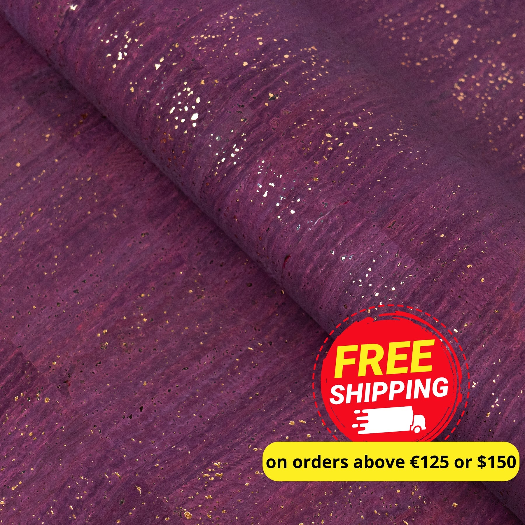 This luxurious cork fabric features a rich plum-purple tone adorned with shimmering gold flecks. With a smooth texture and a soft black fabric backing, it offers a leather-like feel while staying 100% vegan and eco-friendly.