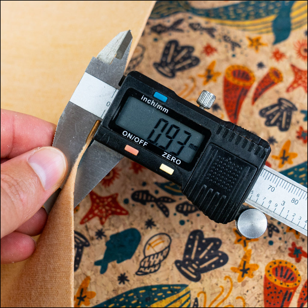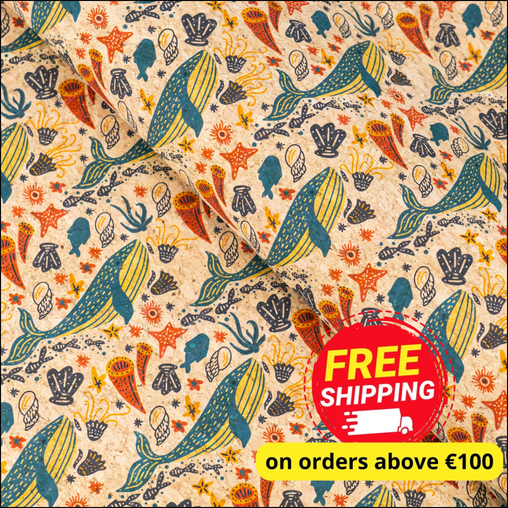 This charming cork fabric features hand-drawn whales, coral, seaweed, and jellyfish in a warm, nautical color palette. Measuring 0.93mm thick and backed with soft textile, it offers excellent flexibility and durability—perfect for ocean-themed pouches, book covers, baby items, and eco-conscious accessories. Ideal for unique, sustainable handmade creations.