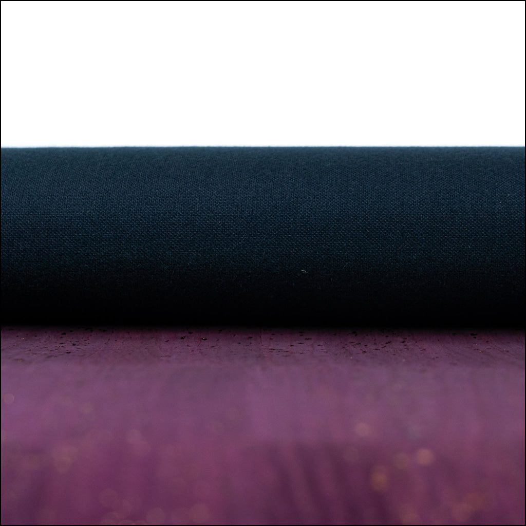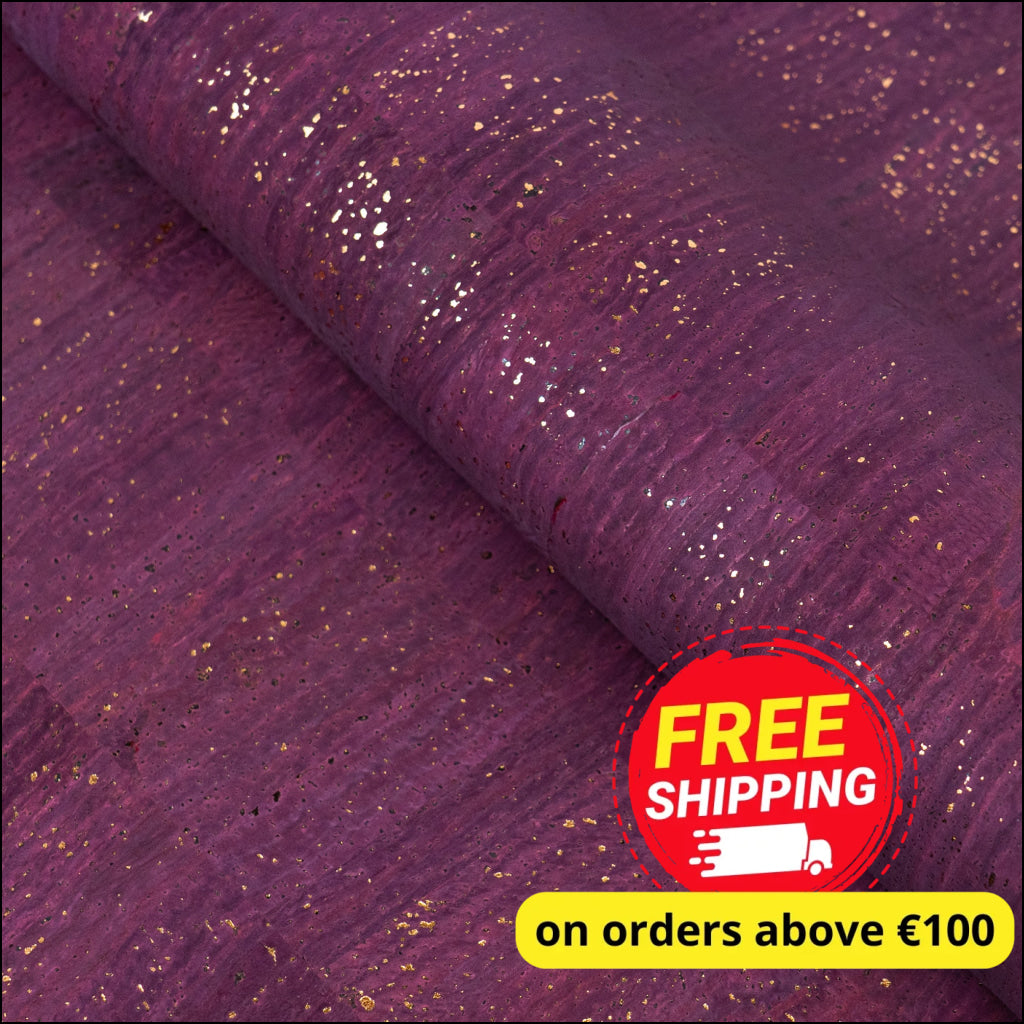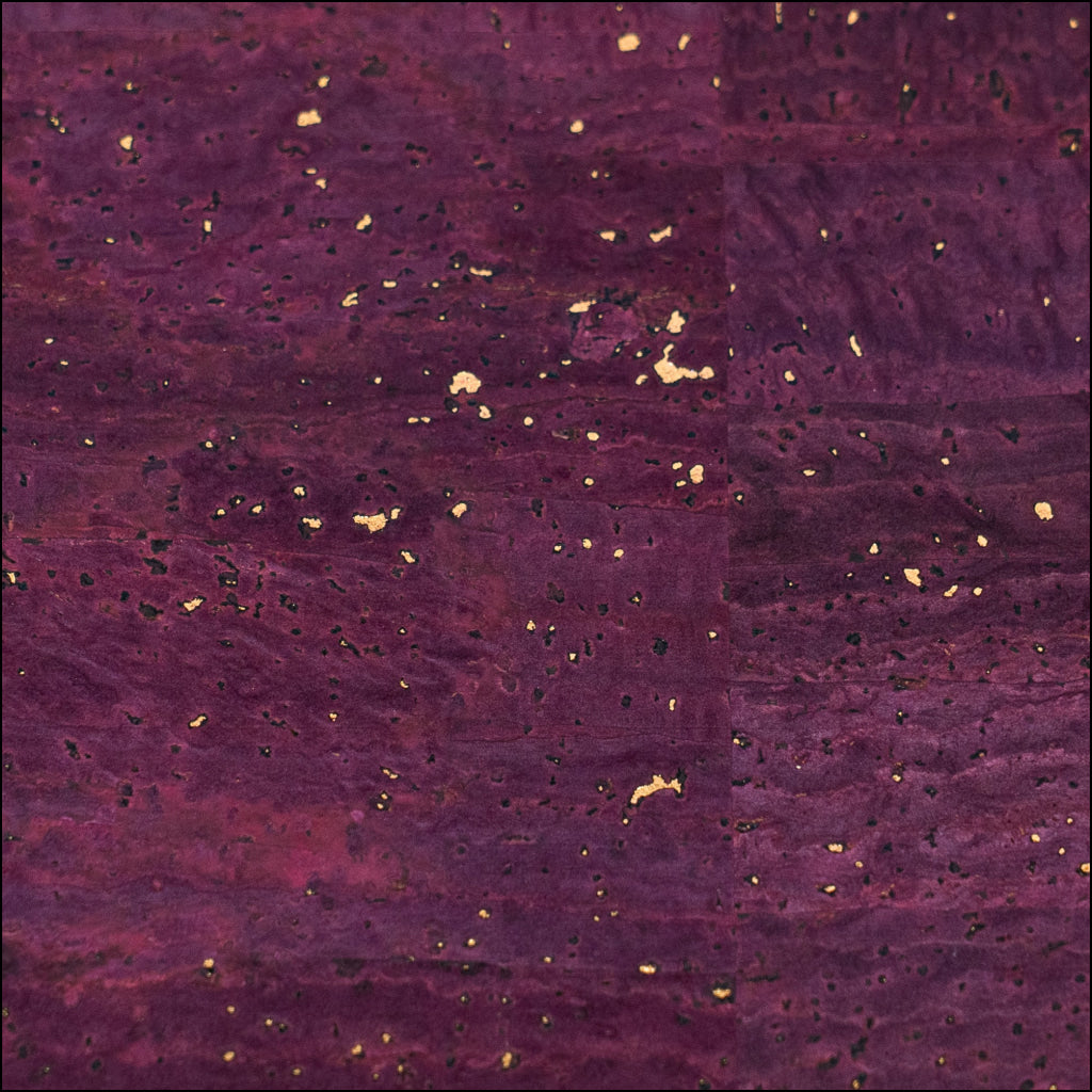 This luxurious cork fabric features a rich plum-purple tone adorned with shimmering gold flecks. With a smooth texture and a soft black fabric backing, it offers a leather-like feel while staying 100% vegan and eco-friendly.