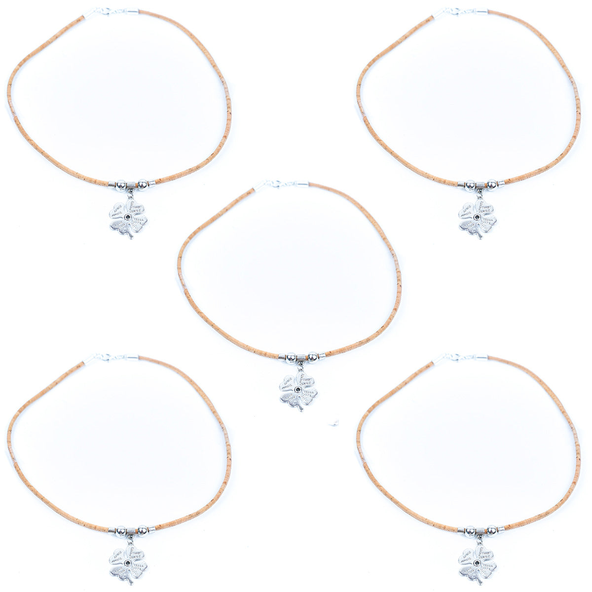 This necklace uses 3mm round natural cork wire, showing a comfortable and natural texture, suitable for daily wear. The highlight of the necklace is a silver alloy pendant in the shape of a four-leaf clover, which symbolizes luck and beauty. The pendant is engraved with "Good Luck" and blessing words in multiple languages, which is rich in meaning and full of warmth. The necklace is paired with simple silver alloy beads, making the overall design more refined. Whether it is an everyday accessory or a gift to express your heart, this necklace is very suitable, bringing good luck while also showing fashion and personality.