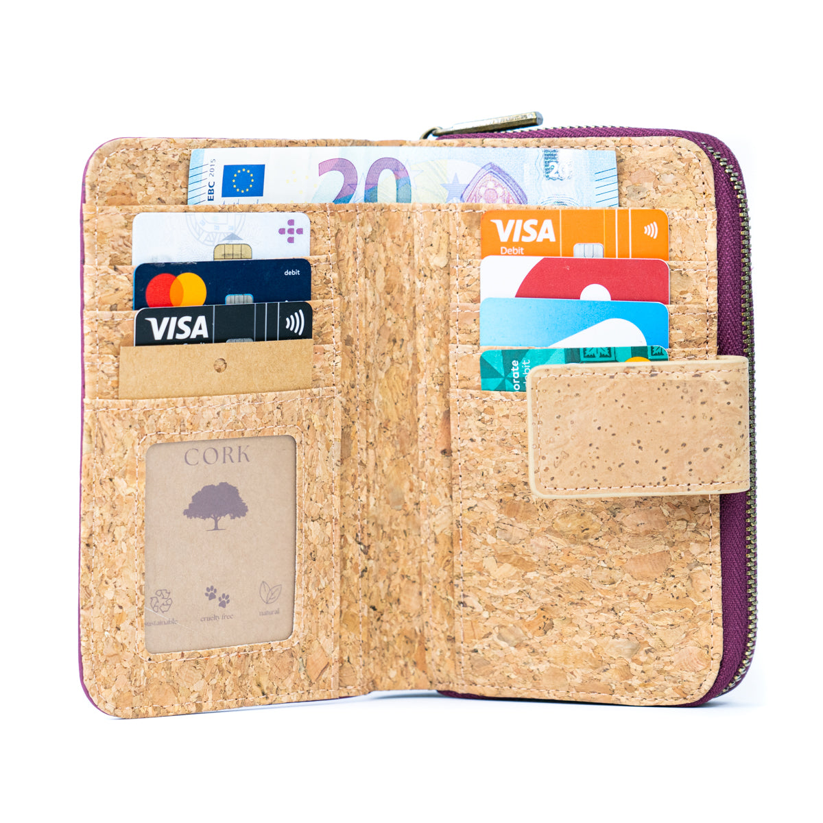 Medium-sized cork wallet made from natural cork material. Available in natural cork and black cork with gold accents.
