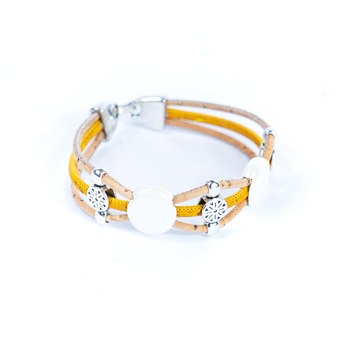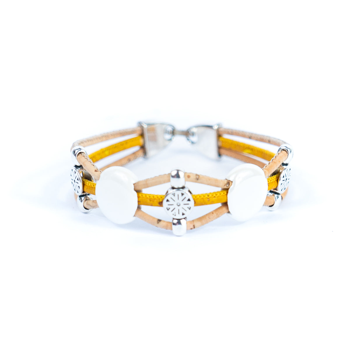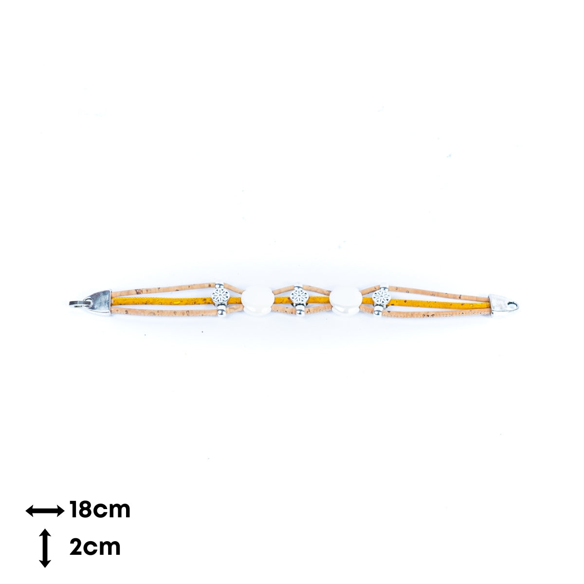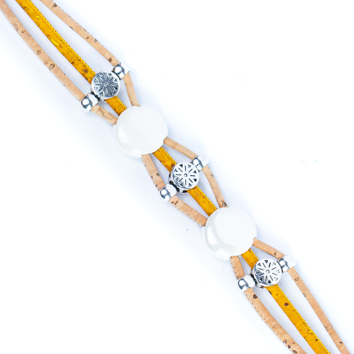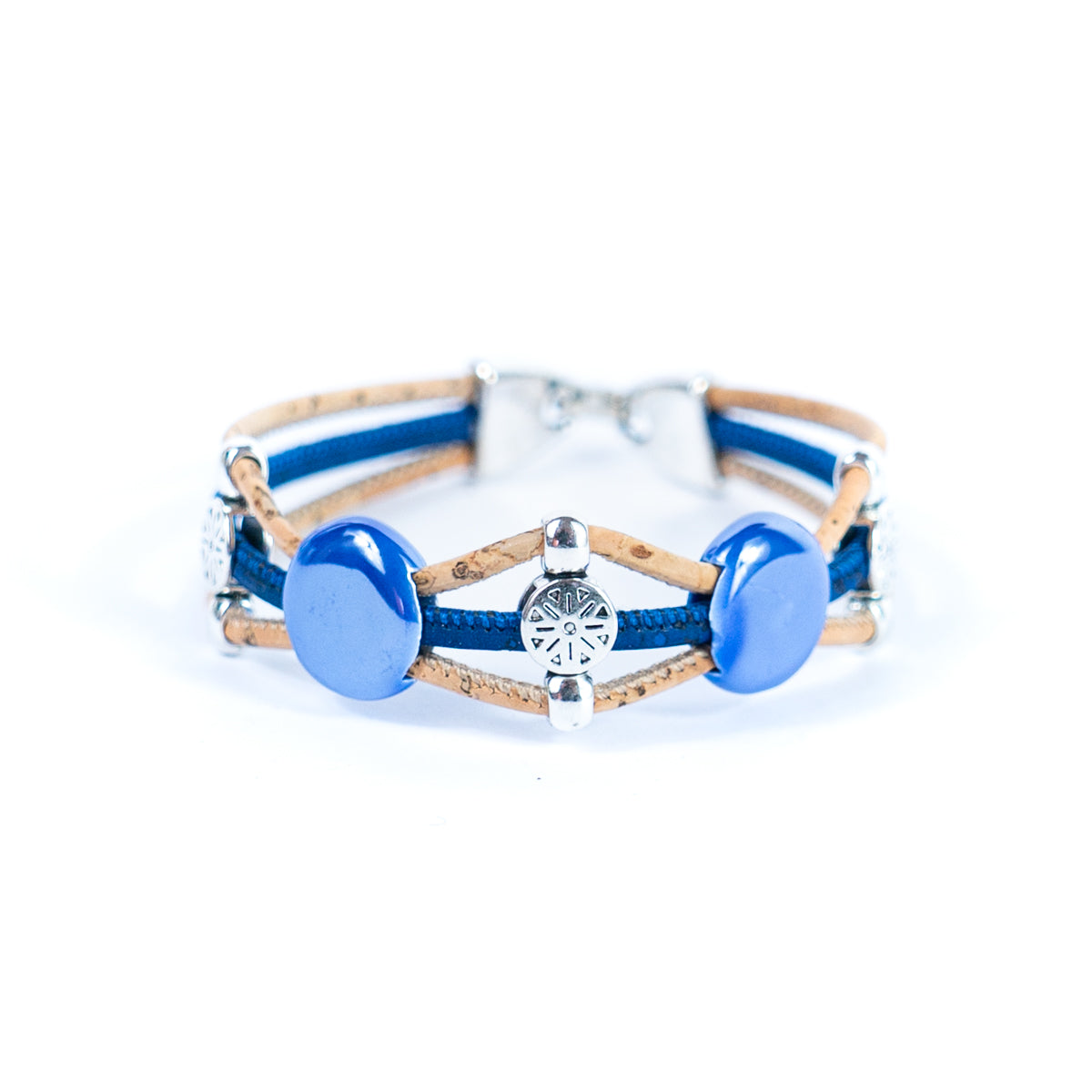 This bracelet is made of one 3mm cork wire and two 2mm cork wires, combining natural and environmentally friendly materials with exquisite craftsmanship, with unique design and comfortable wearing. The core decoration of the bracelet is colorful porcelain pieces, each of which is carefully selected and made to show rich colors and luster.