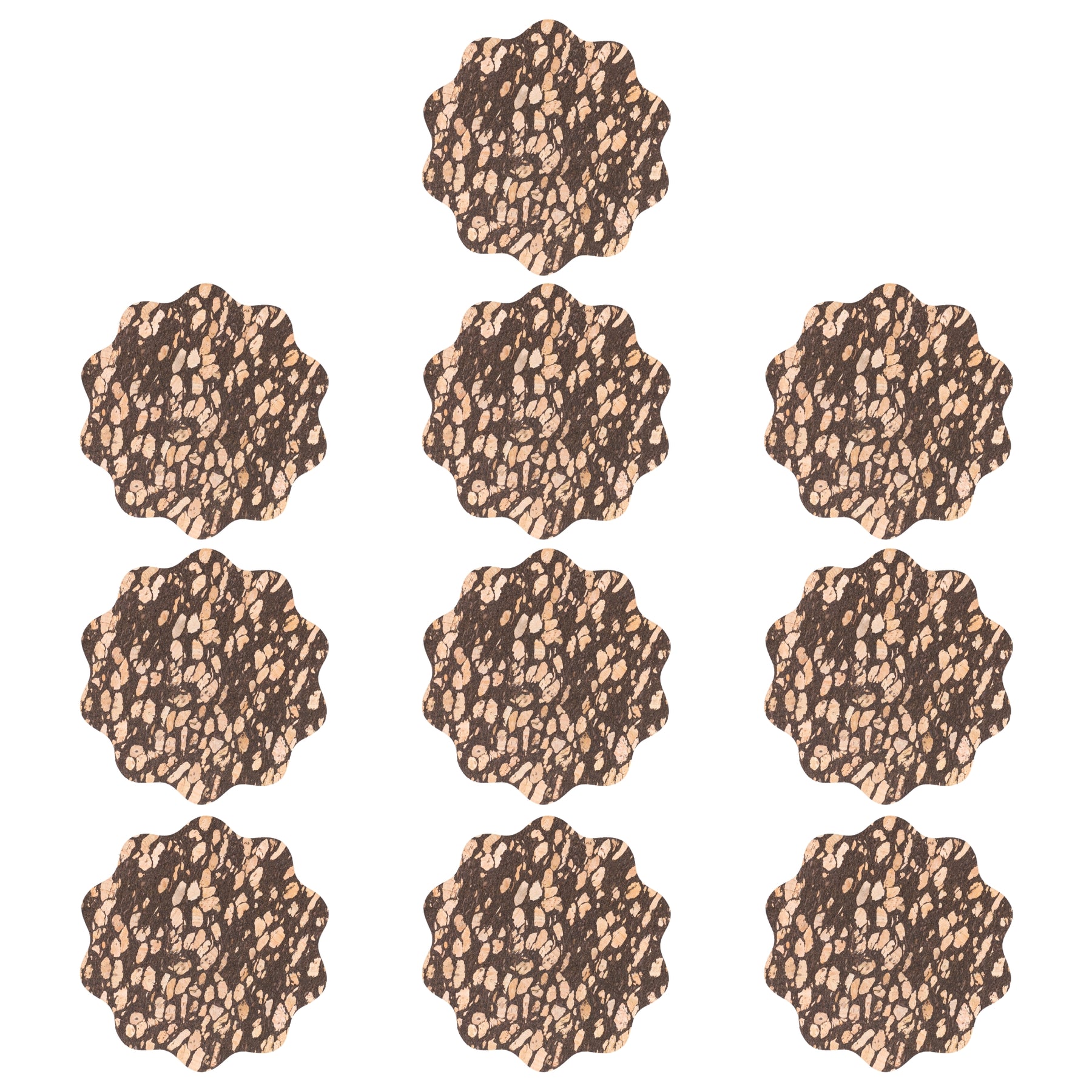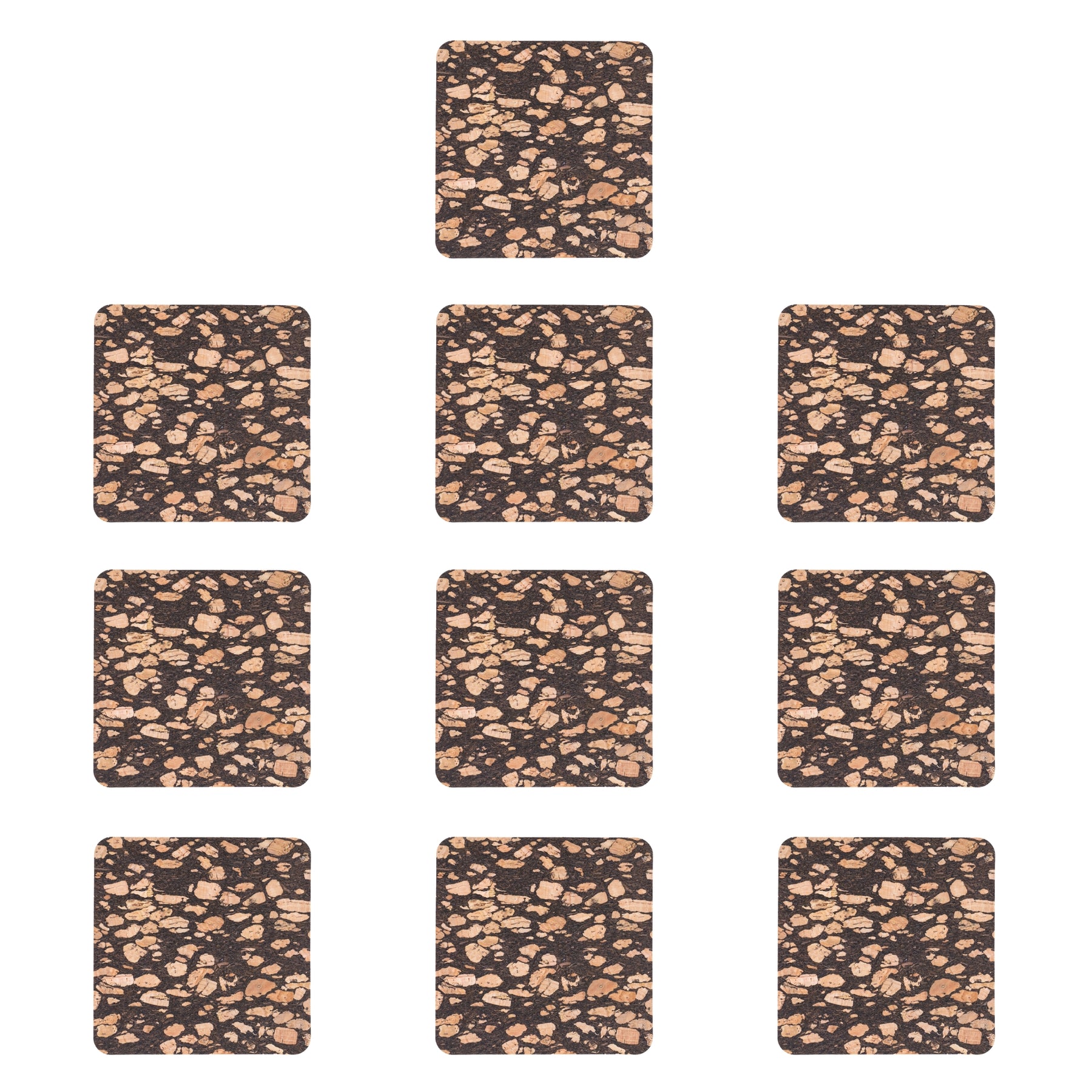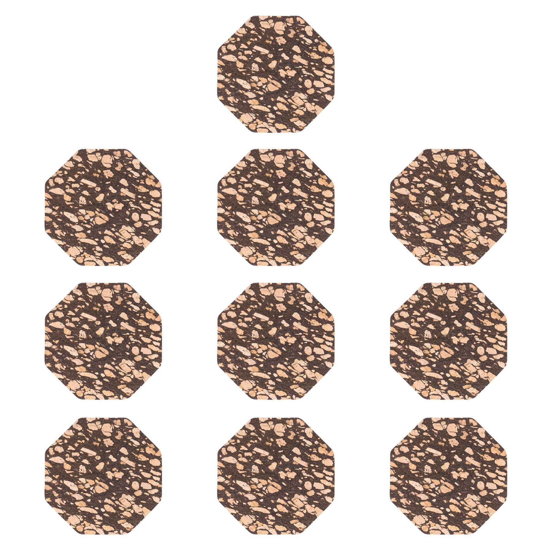 Protect your surfaces naturally with this set of 10 cork coasters made from natural cork blended with recycled coffee grounds. The black speckled pattern comes from real coffee grounds, giving each coaster a unique, earthy look while promoting sustainability.