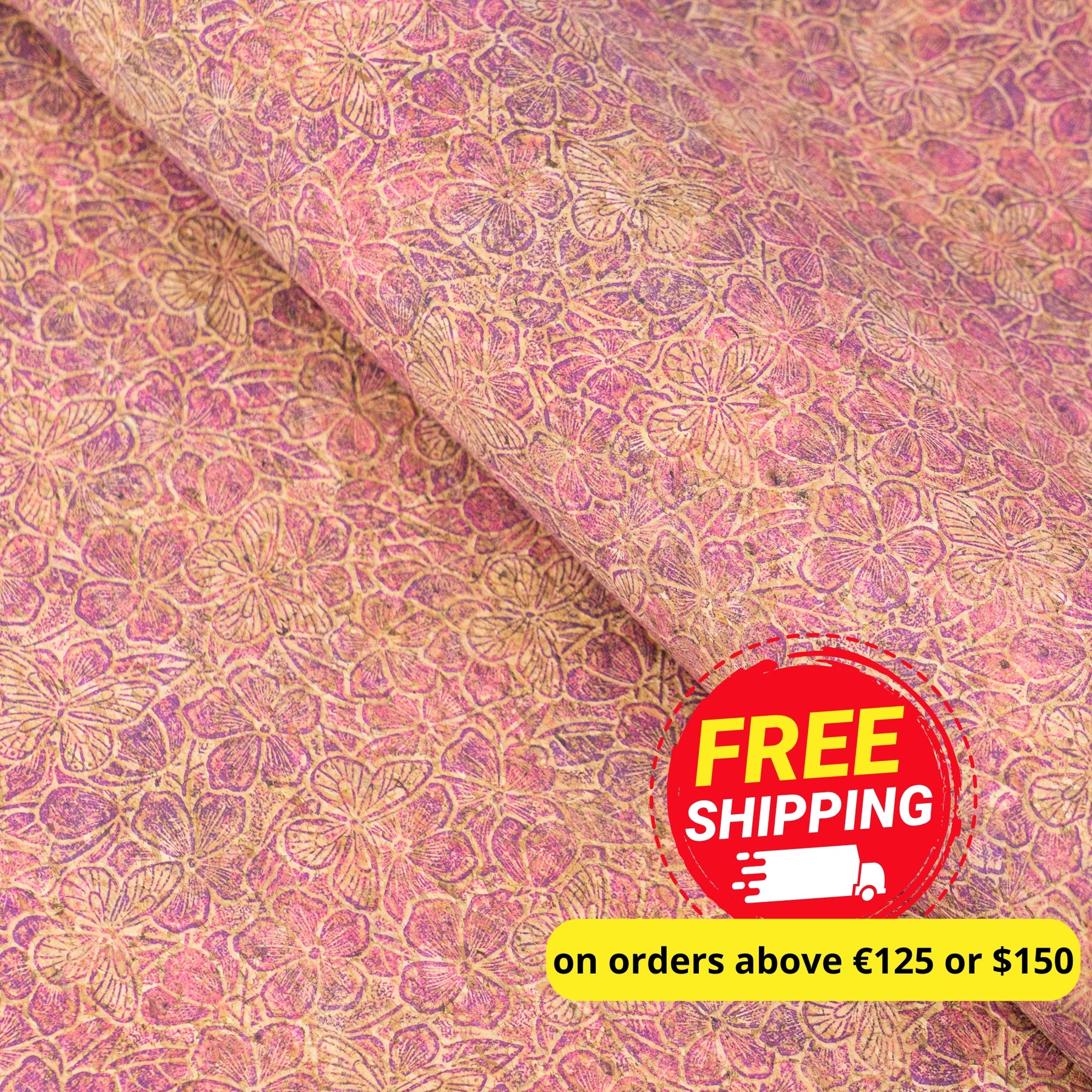 Add a natural yet artistic touch to your creations with this embossed cork fabric. Featuring a delicate pink and purple floral and butterfly pattern over a warm cork background, this fabric combines eco-friendly material with elegant design. The surface is soft yet durable, and the embossed details give it a unique texture and depth.