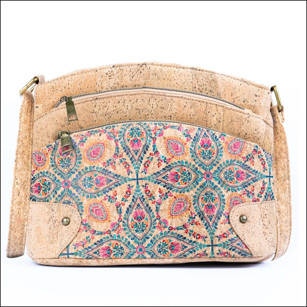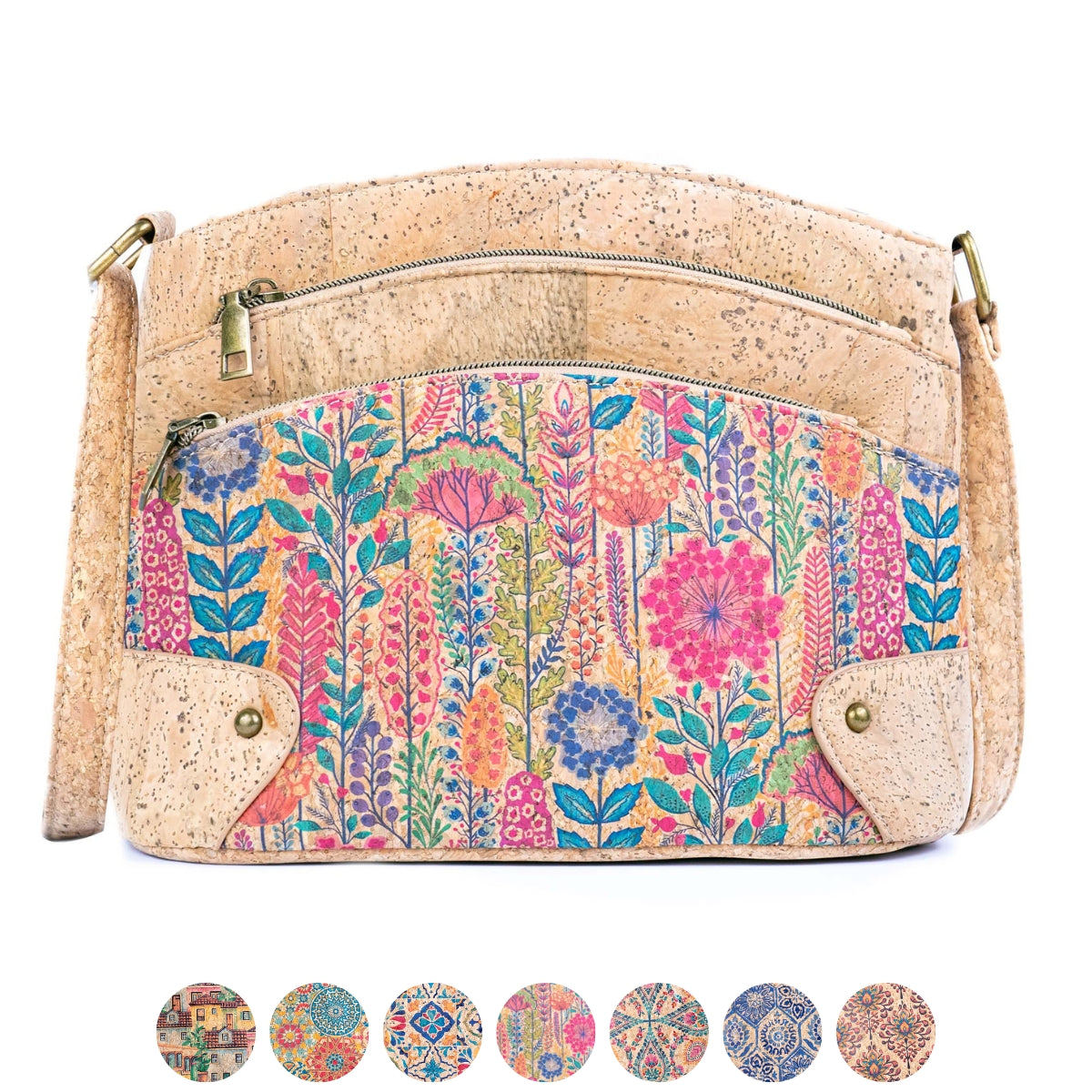 Our Three-Line Zipper Natural Cork Crossbody Bag for Women, adorned with beautiful floral and tile pattern prints. This bag is a testament to exquisite craftsmanship, featuring decorative rivets along the edges that add an elegant touch.
