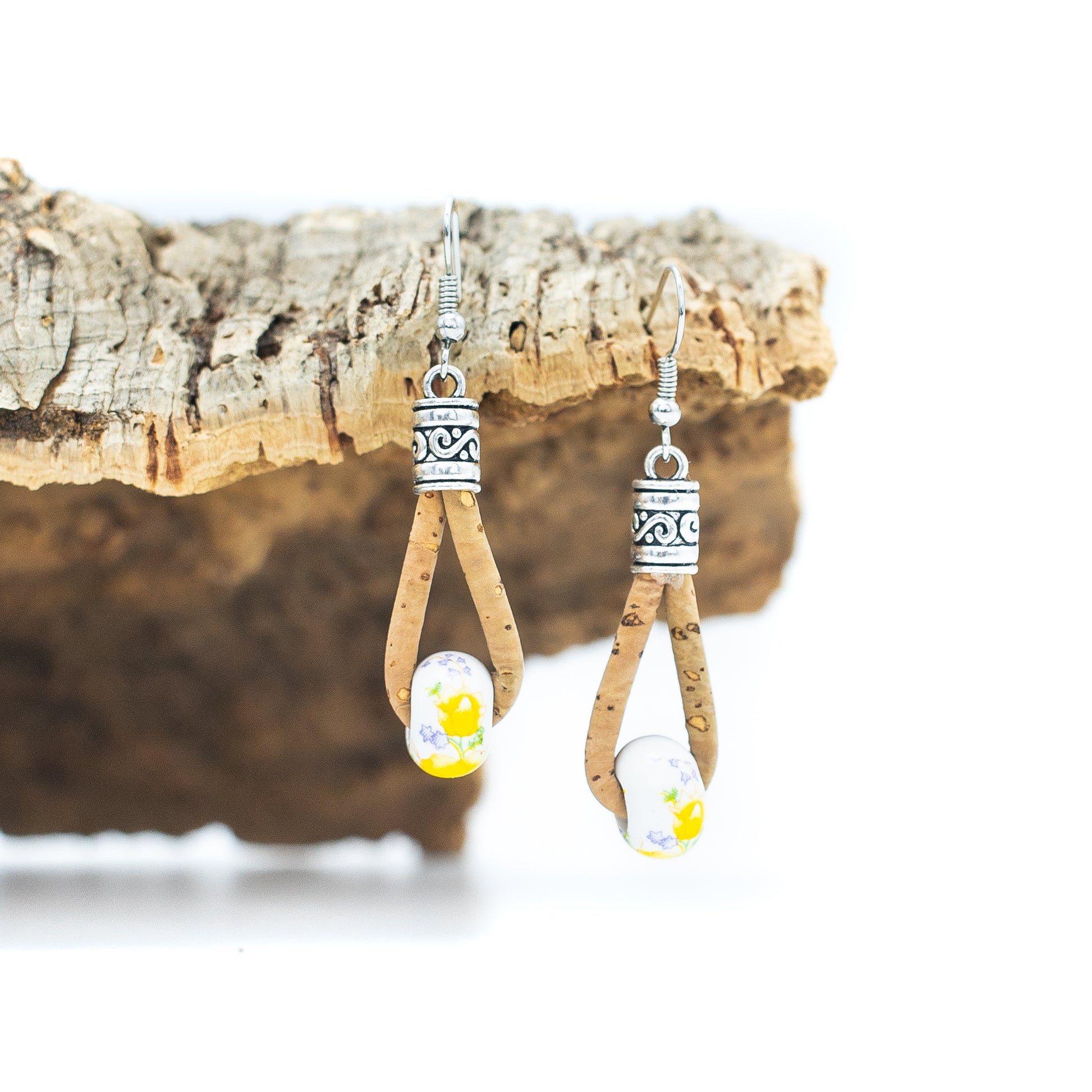 These natural cork drop earrings combine 3mm round cork wire, ceramic beads and retro alloy accessories to create lightweight, eco-friendly and stylish accessories. The soft cork wire gives the earrings a natural and warm texture, and the hand-painted floral ceramic beads add a touch of retro elegance, making each pair of earrings unique.