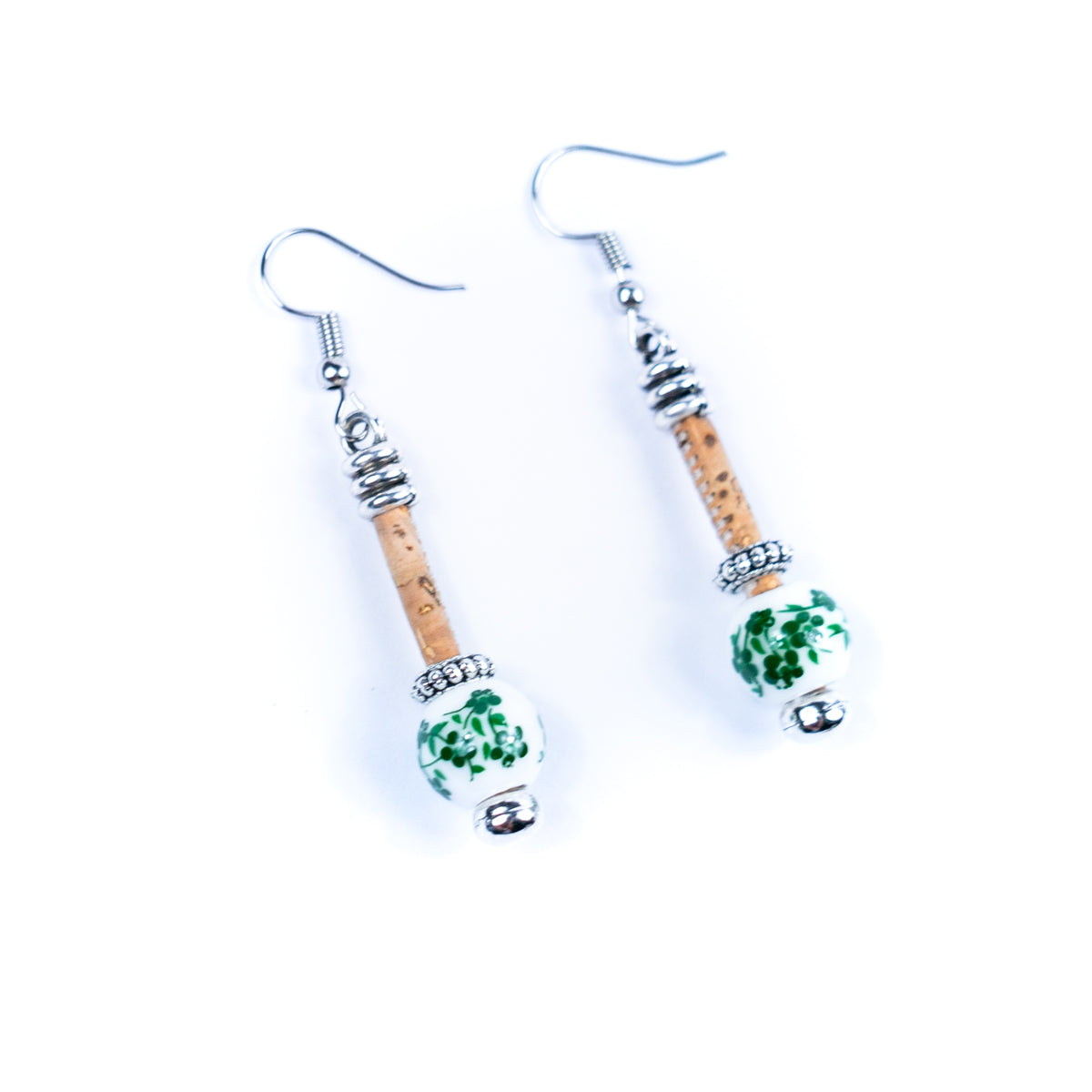 Ceramic bead cork cord earrings are a type of handmade jewelry that typically feature a small ceramic bead attached to a cork cord that is used to dangle the earring from the ear. These earrings are popular for their natural and rustic look, as well as their lightweight feel. The ceramic beads used in these earrings come in a variety of colors, with floral designs. Cork cord, which is made from the bark of the cork oak tree, is a durable and sustainable material that is often used in jewelry making. Ceramic bead cork cord earrings can be a unique and stylish addition to any outfit, and can be found in many artisanal and handmade markets around the world. They can also be made at home with a few basic materials and some creativity. SET OF 5 Material: Cork cord
