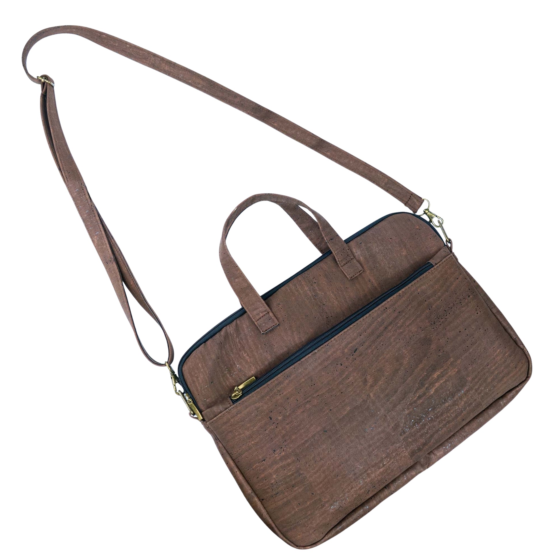A professional and sustainable laptop bag crafted from premium cork fabric, featuring a front zip pocket and detachable shoulder strap.