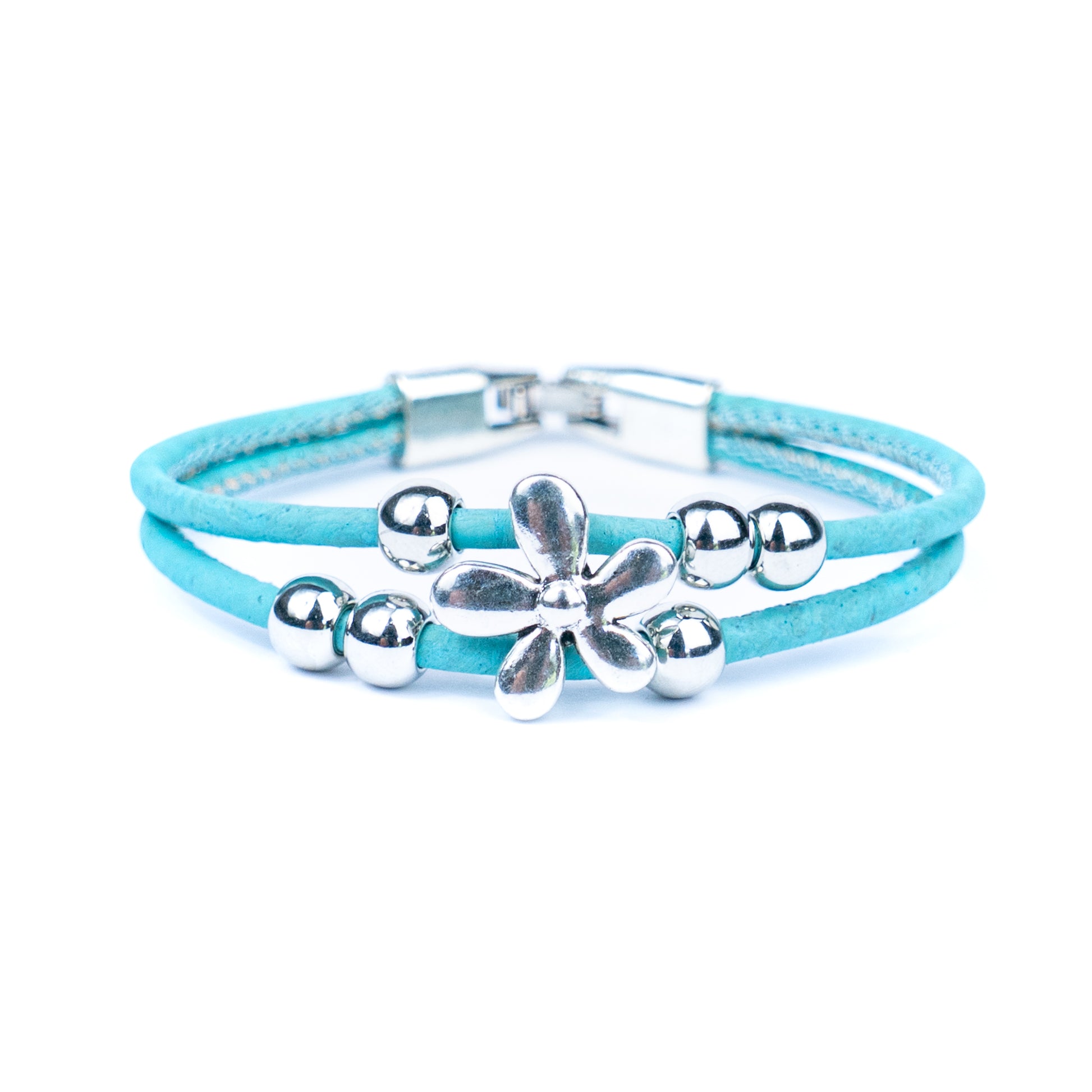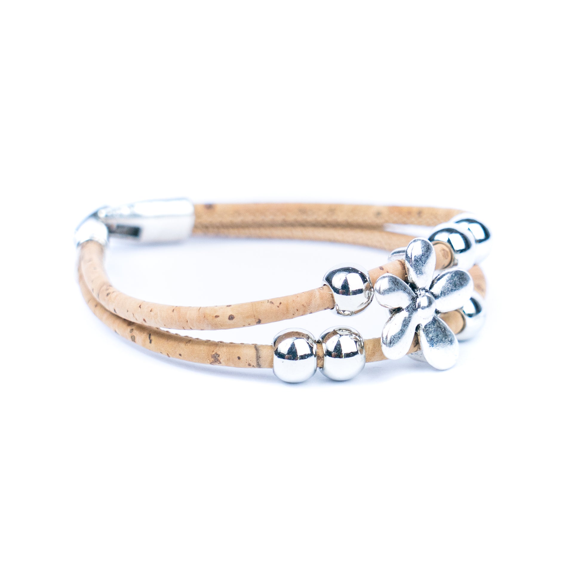 Crafted from natural cork cord in a variety of colors, this bracelet features a silver flower centerpiece and is embellished with alloy beads. The magnetic clasp adds a touch of sophistication and is comfortable and easy to wear.