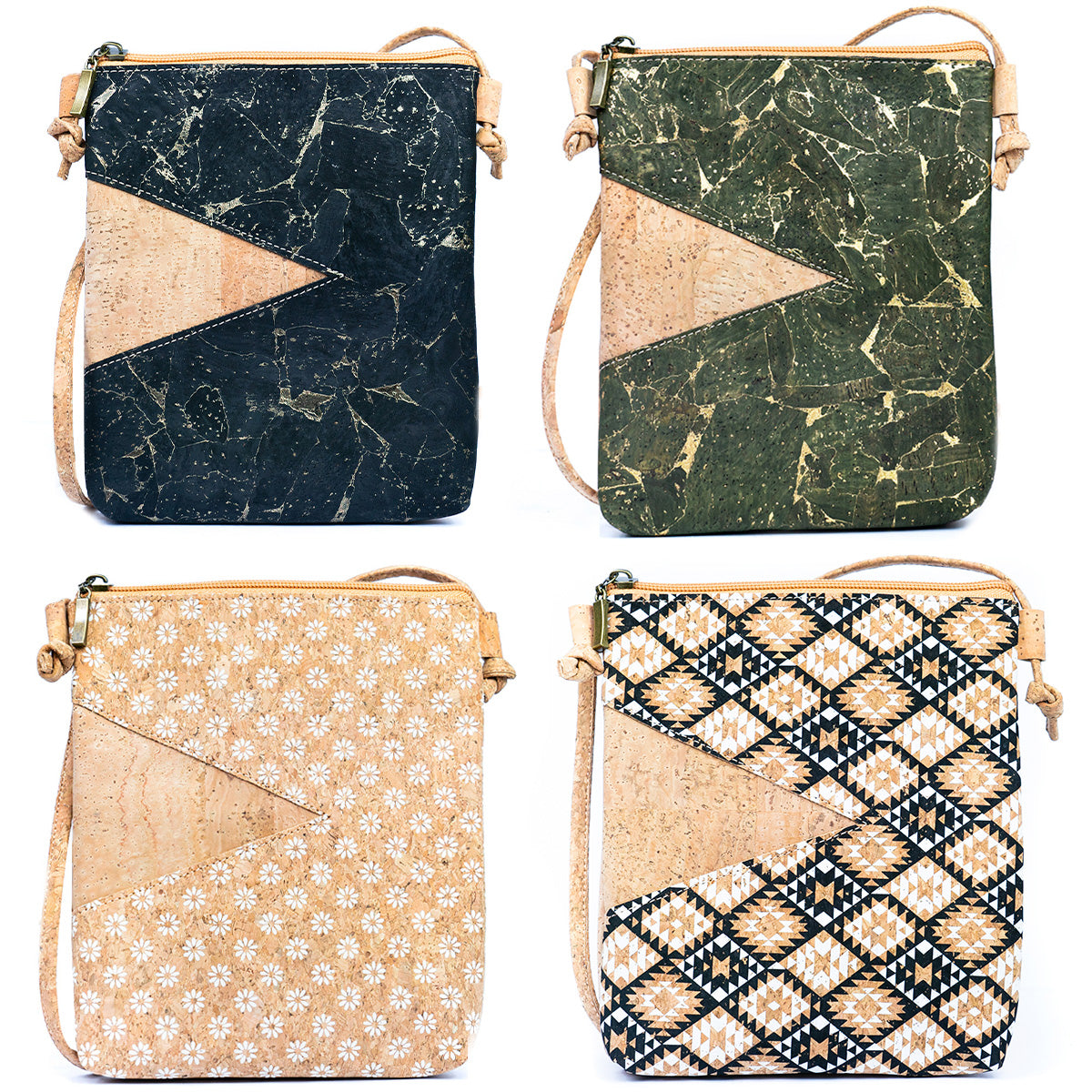 Elevate your accessory game with our Geometric Cut Style Natural Cork Ladies' Crossbody Phone Bag Set. Crafted from premium cork material, these bags exude sophistication while embracing eco-consciousness. Each set includes four distinct styles: black with gold accents, green with gold accents, white with ethnic floral patterns, and a mix of all four for versatile chic.