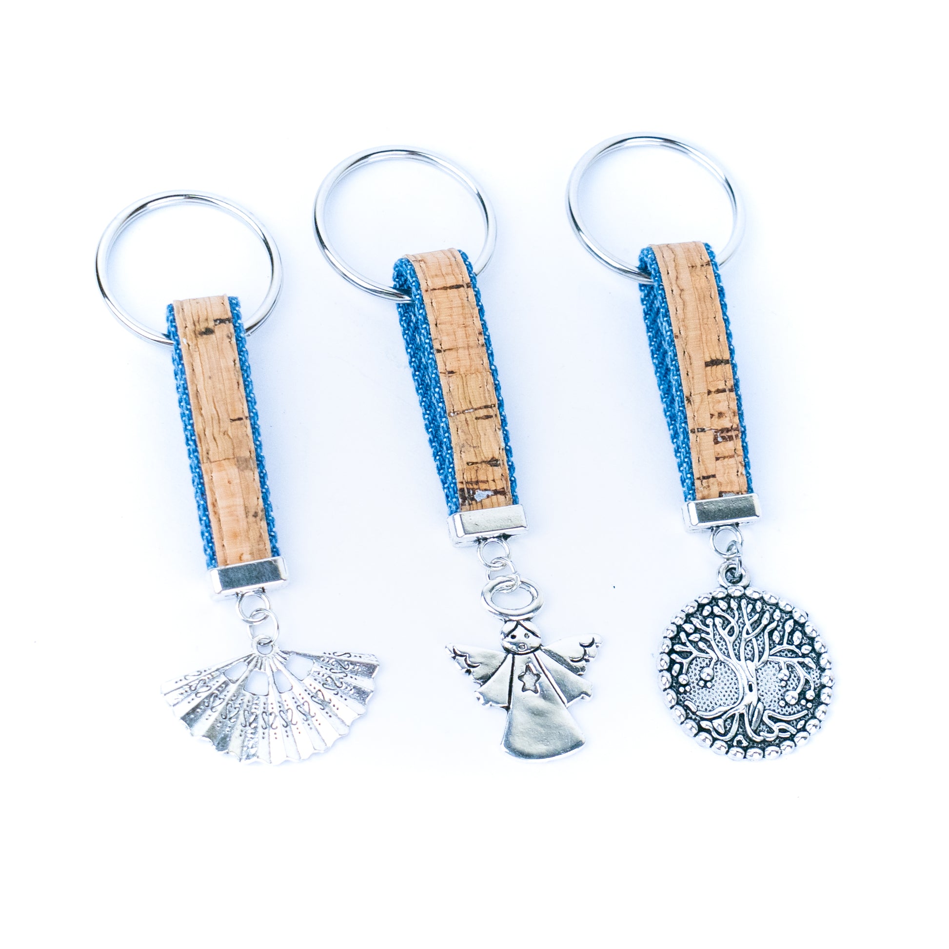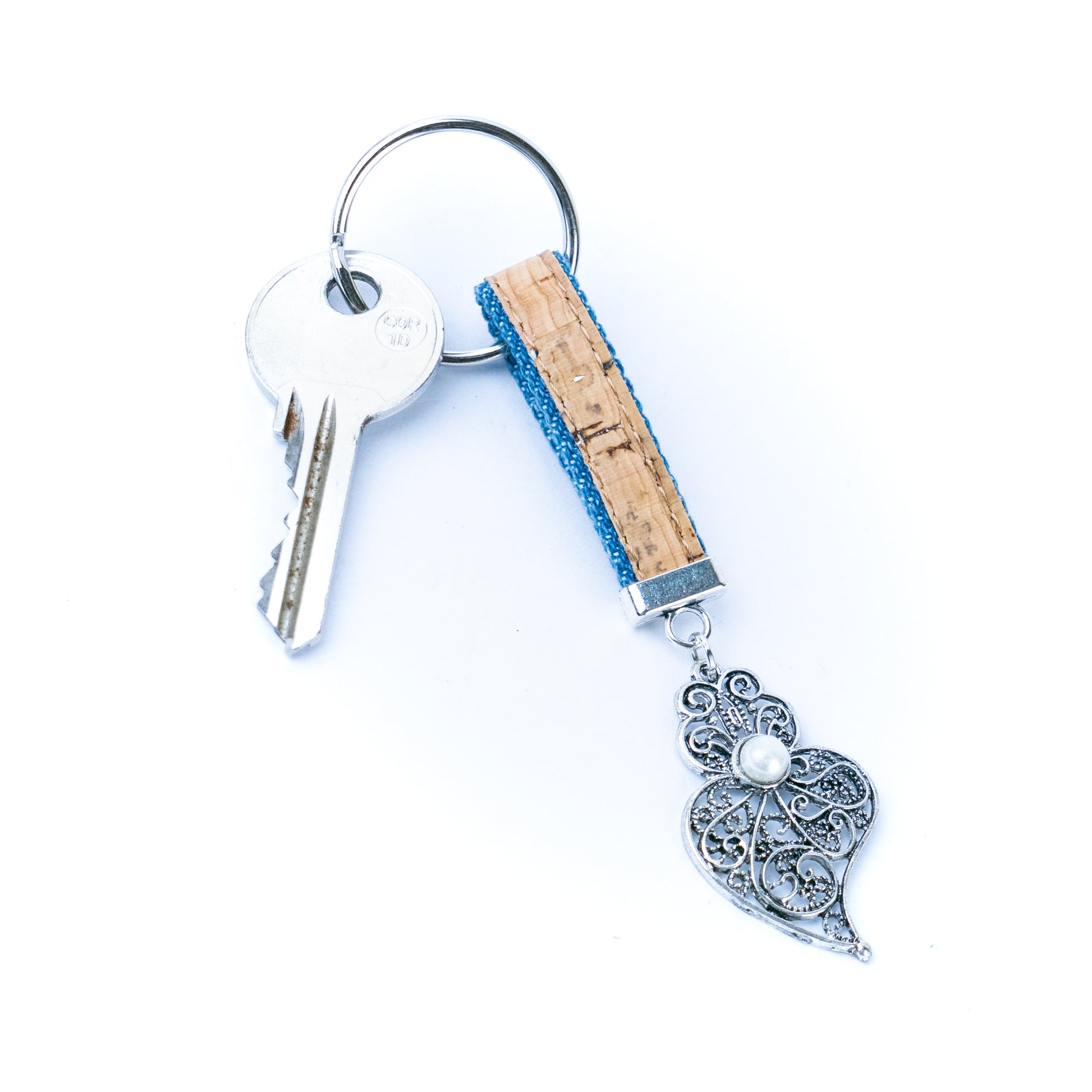 These beautiful keychains are handcrafted in Portugal using eco-friendly natural cork cord and denim fabric, accented with a variety of intricate silver-toned alloy charms.