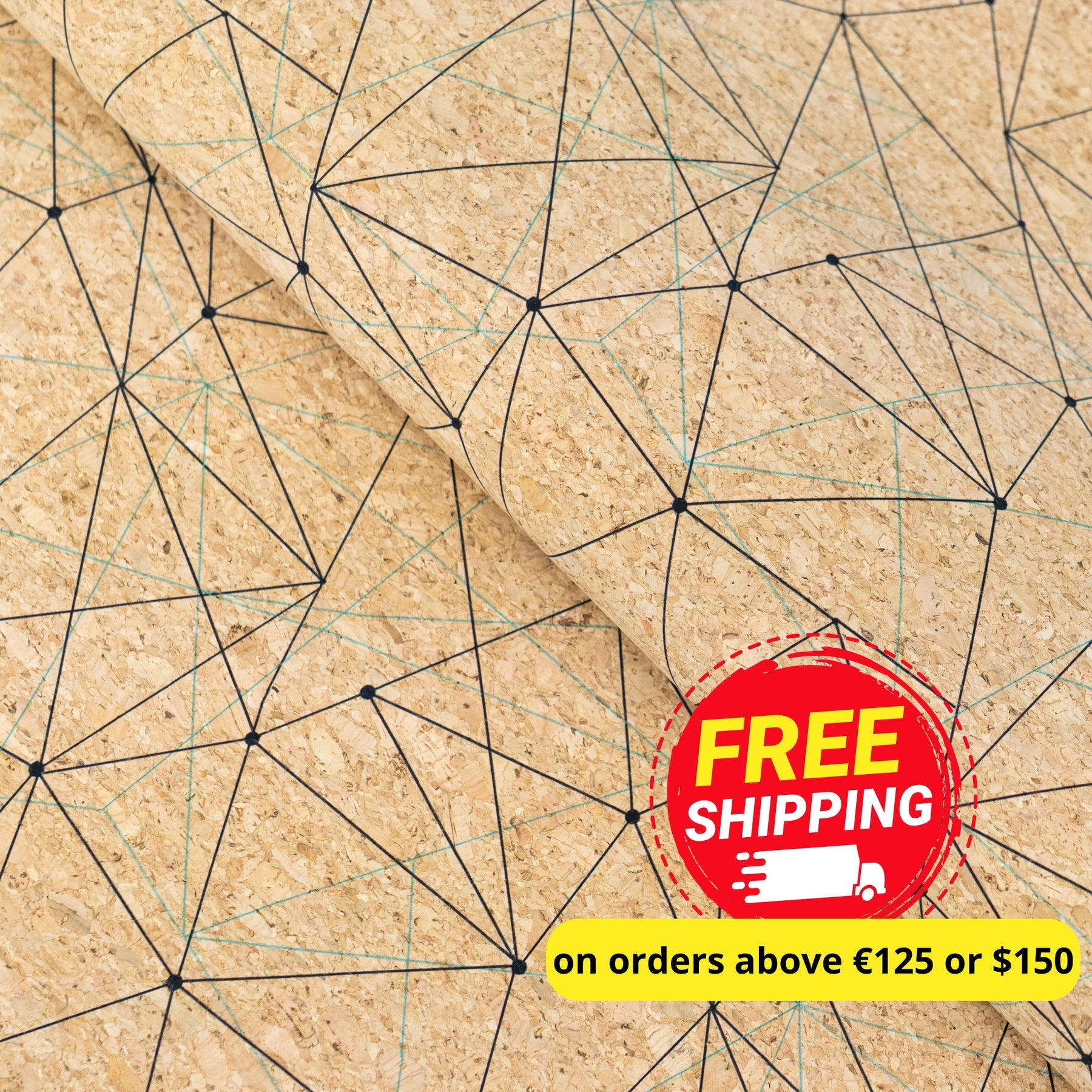 Give your projects a contemporary edge with this natural cork fabric featuring a modern abstract geometric line pattern in black and green. The unique design stands out on the natural cork surface, blending sustainability with style for fashion, crafts, and décor.
