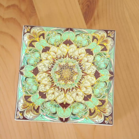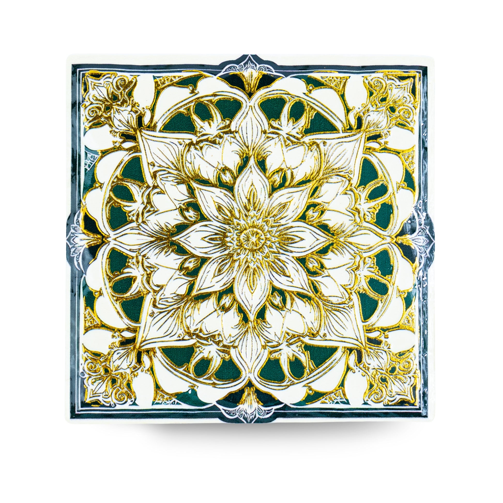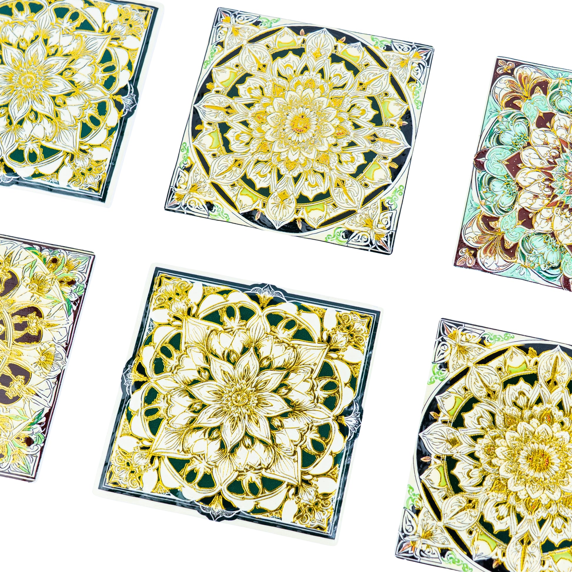 Each coaster features a unique mandala pattern with golden detailing, making them both artistic and practical.