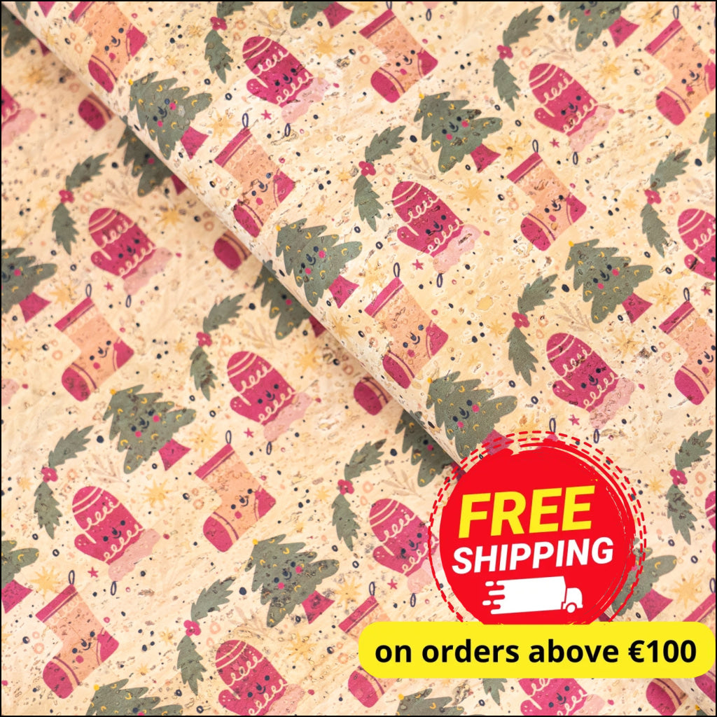 Holiday Special - Cozy Mittens Stockings & Trees on Natural Cork Fabric COF-10 1/2M (138*50 cm / 54*19 inches) cork