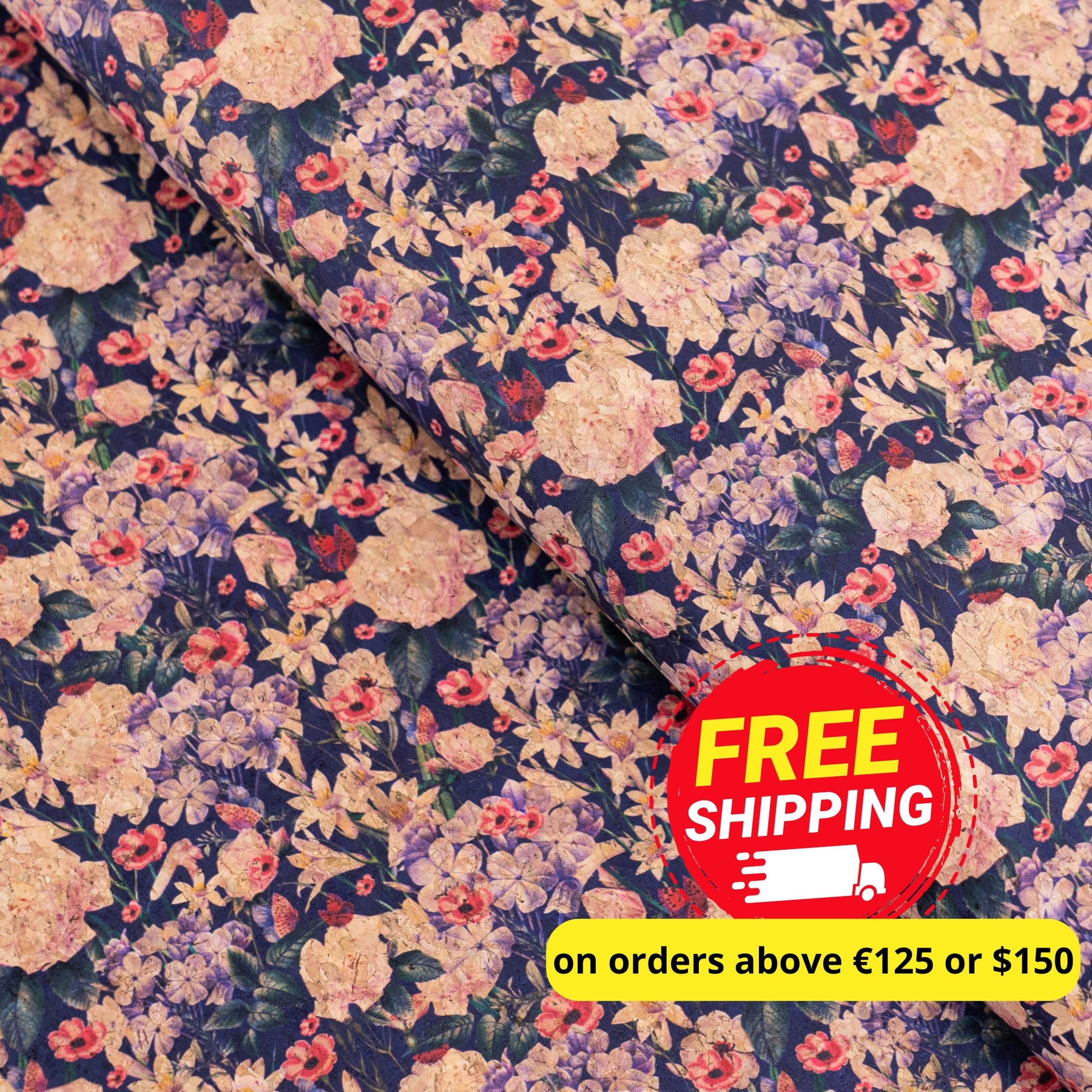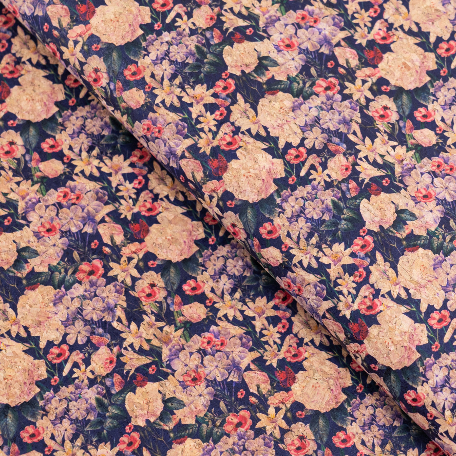 This cork fabric features an elegant floral pattern set against a deep blue background, creating a rich and sophisticated contrast. Soft pastel flowers in shades of cream, blush, lavender, and coral are layered with delicate botanical details, resulting in a timeless and romantic design with strong visual depth.