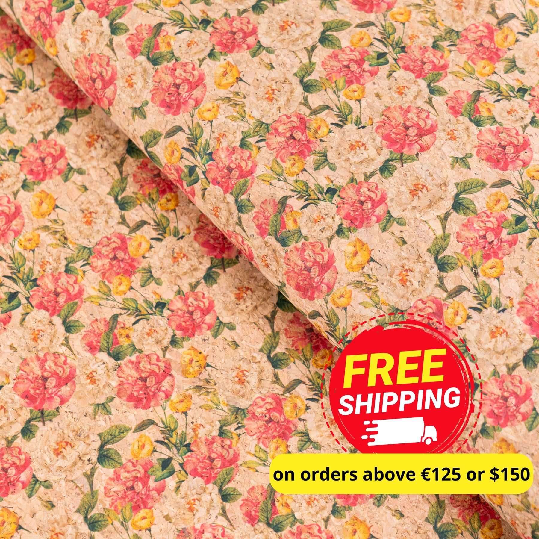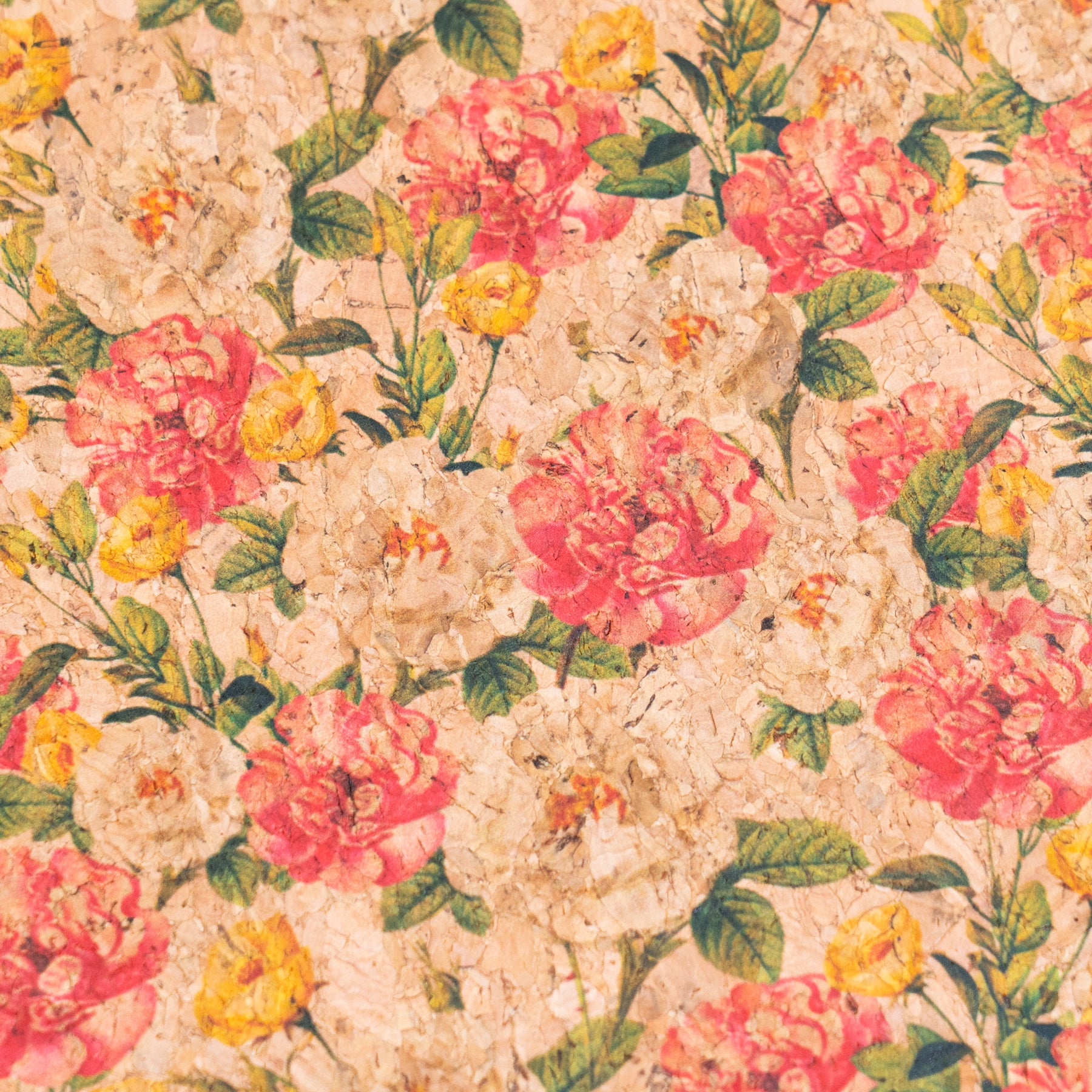 This cork fabric features a timeless floral pattern with classic roses in soft pink, cream, and warm yellow tones, beautifully complemented by natural green leaves. Set against the natural cork background, the design feels romantic, elegant, and softly vintage, making it a versatile choice for a wide range of creative projects.