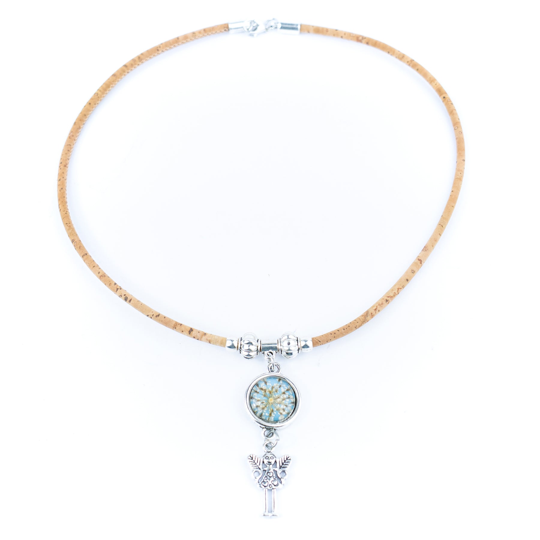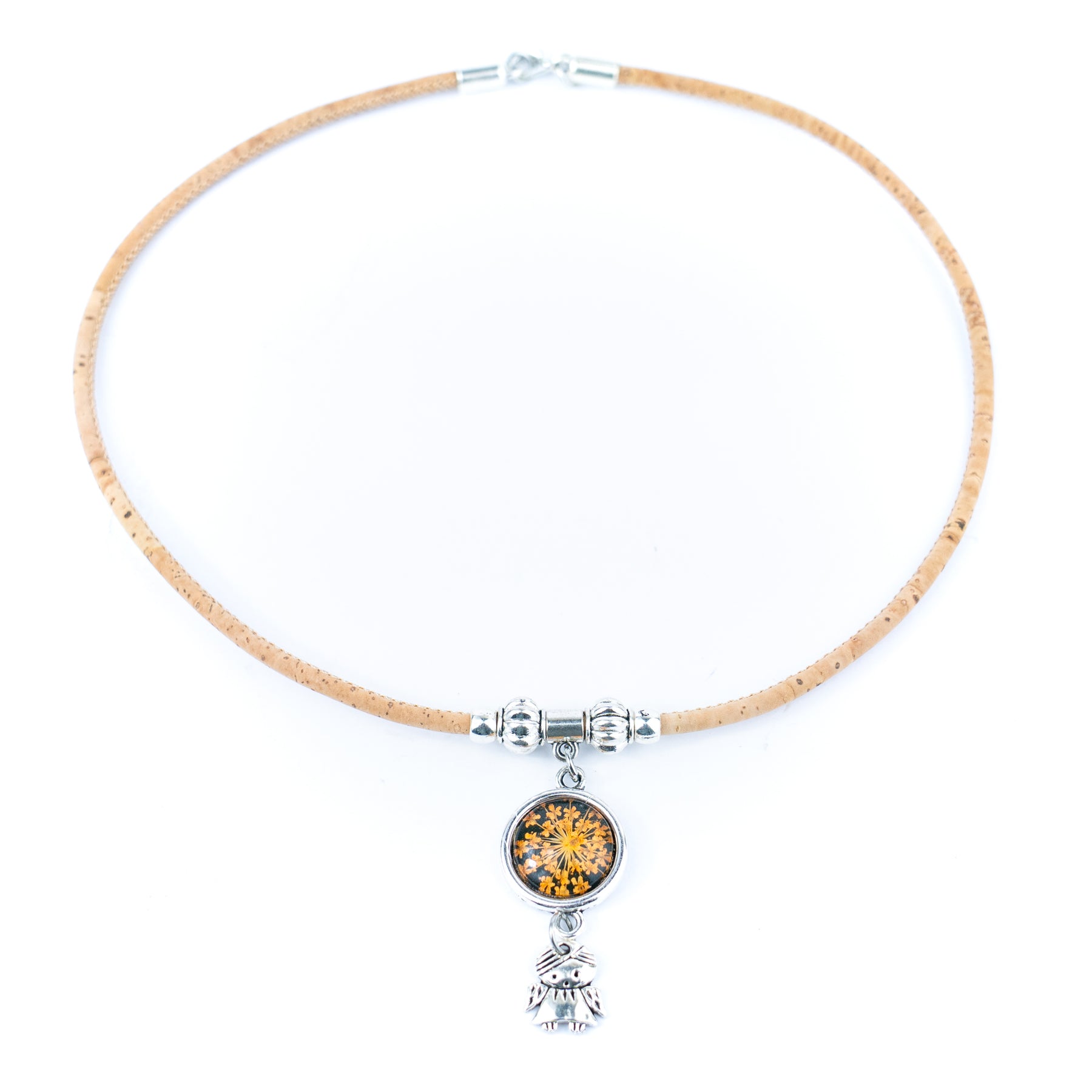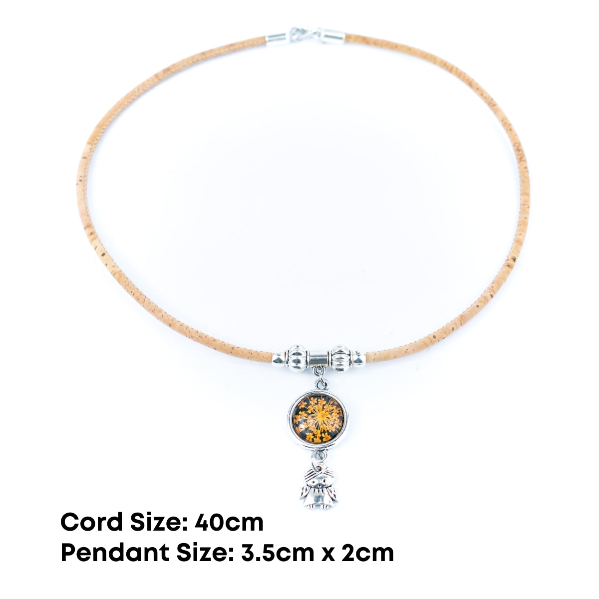 Materials: Natural cork cord + alloy hardware + dried flower resin pendant