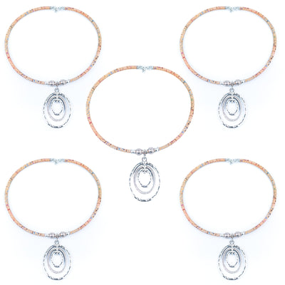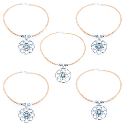 Natural cork cord and a vintage-style geometric floral pattern handmade women's fashion necklace N-003-5