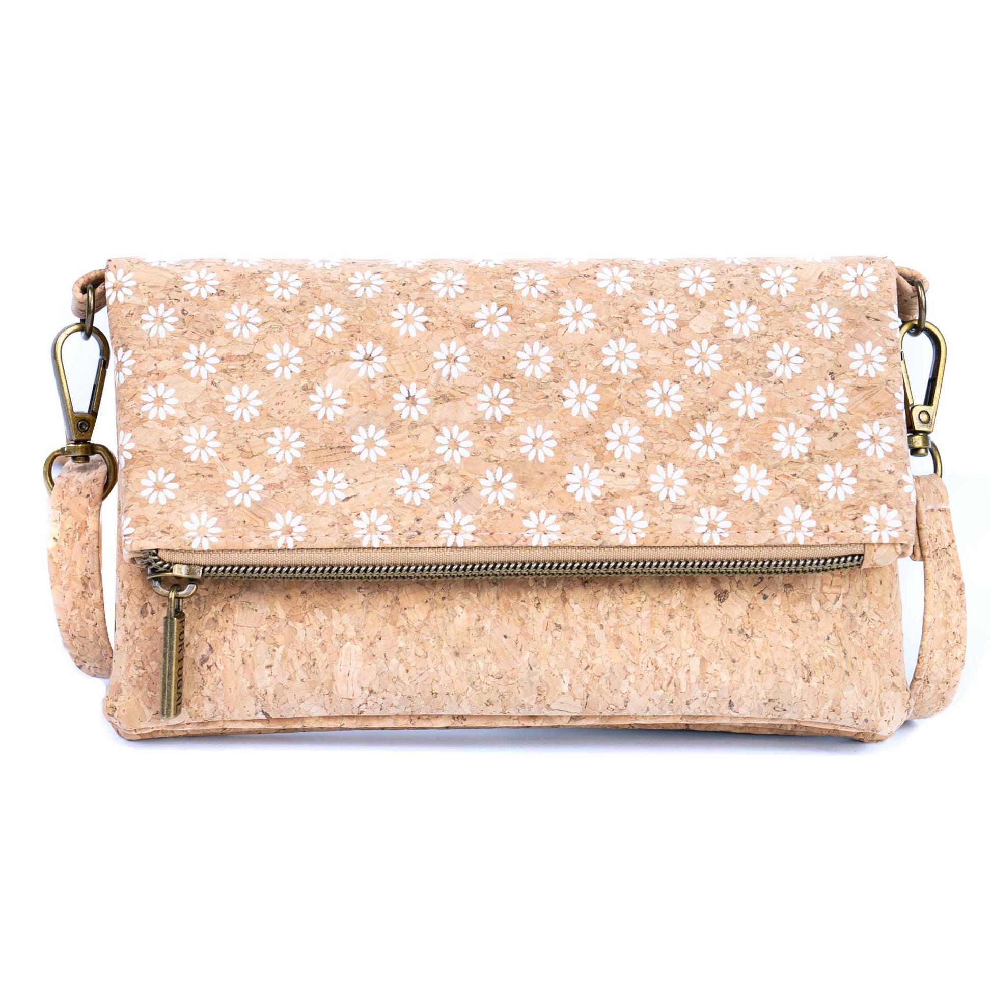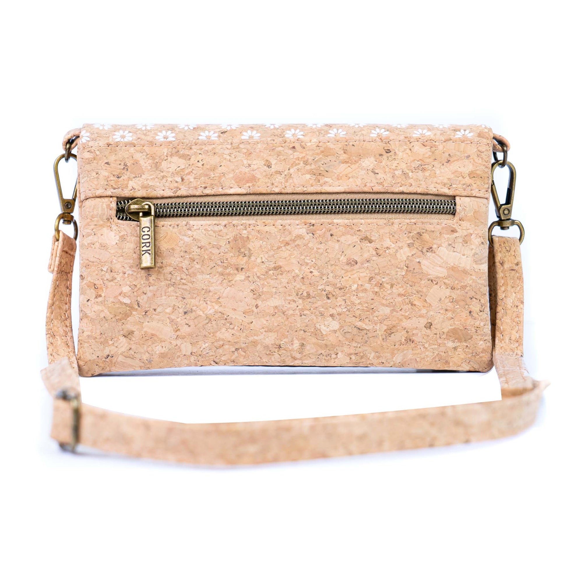 A compact cork crossbody bag designed for everyday essentials. Made from natural cork with a cute daisy-print flap, it’s lightweight, durable, and easy to carry. The foldover flap with snap closure keeps your items secure, while the zip compartment and extra zip pocket help you stay organized—perfect for phone, cards, keys, and small must-haves.