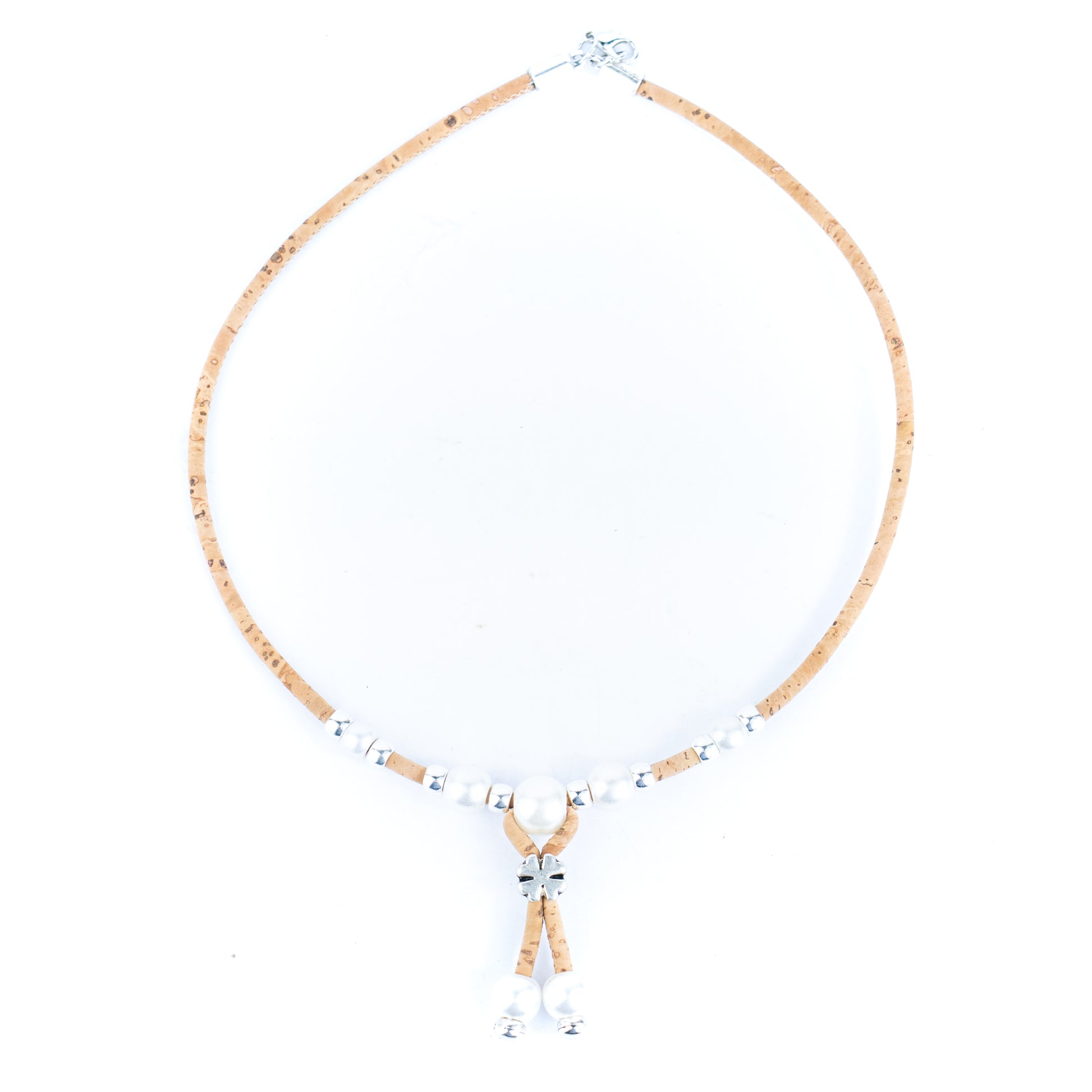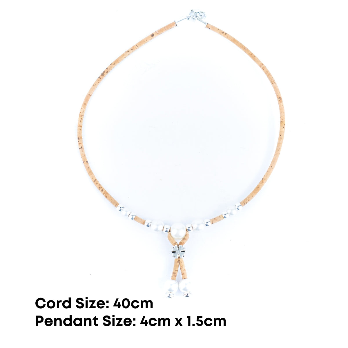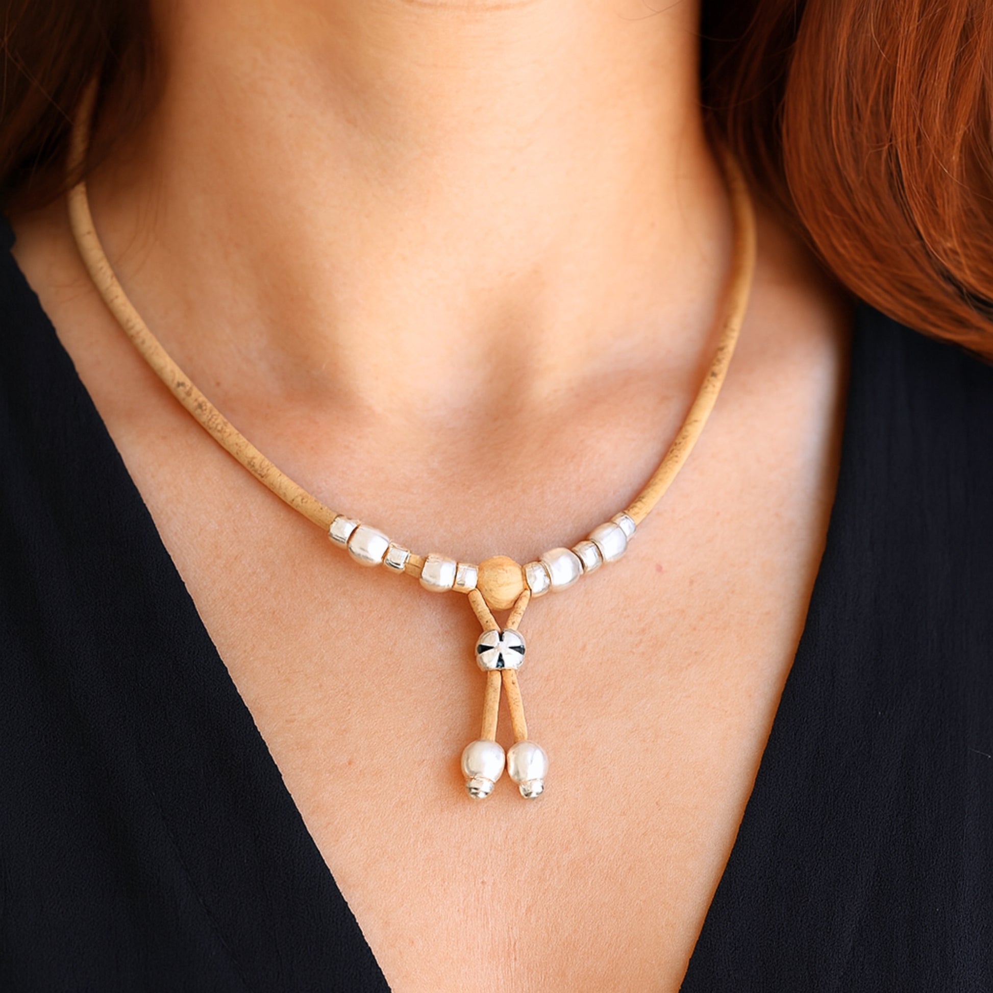 This elegant necklace is handcrafted from 3mm soft colored Portuguese cork cord, decorated with shiny plastic pearls and metal alloy beads. Lightweight, eco-friendly, and vegan, it reflects the beauty of natural materials while maintaining a modern feminine charm.