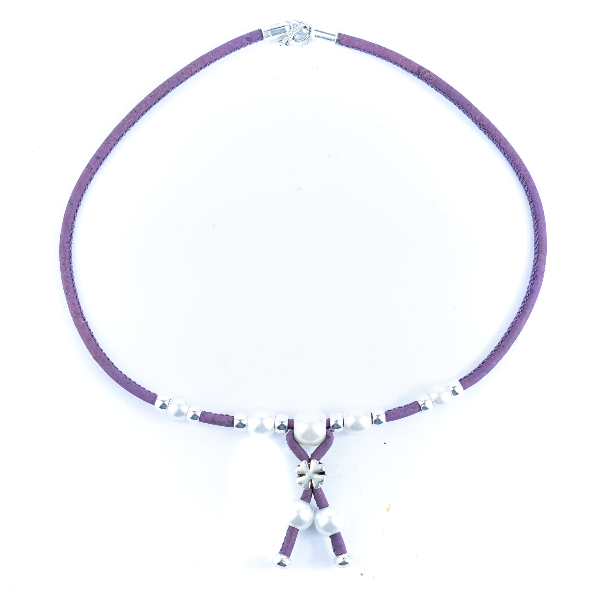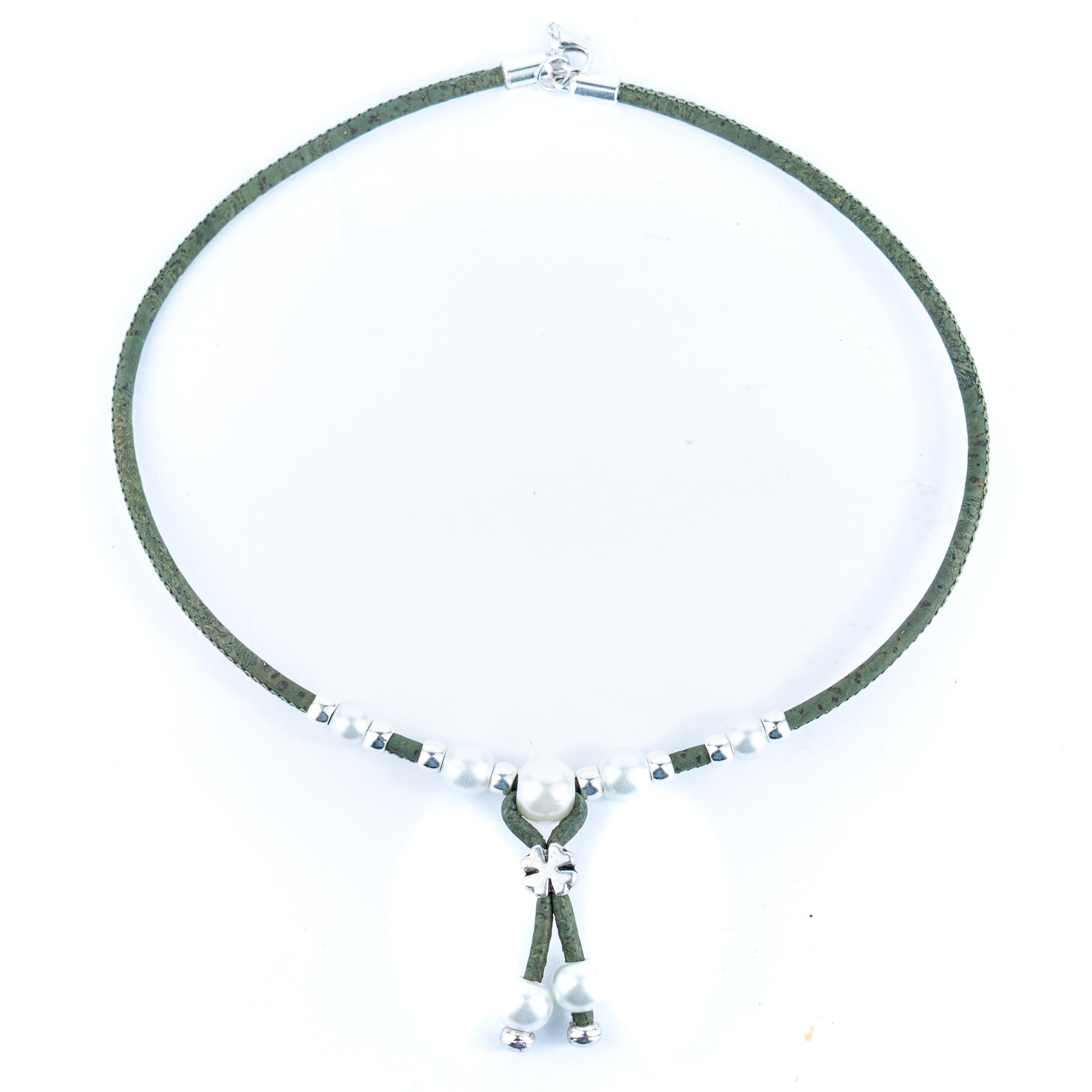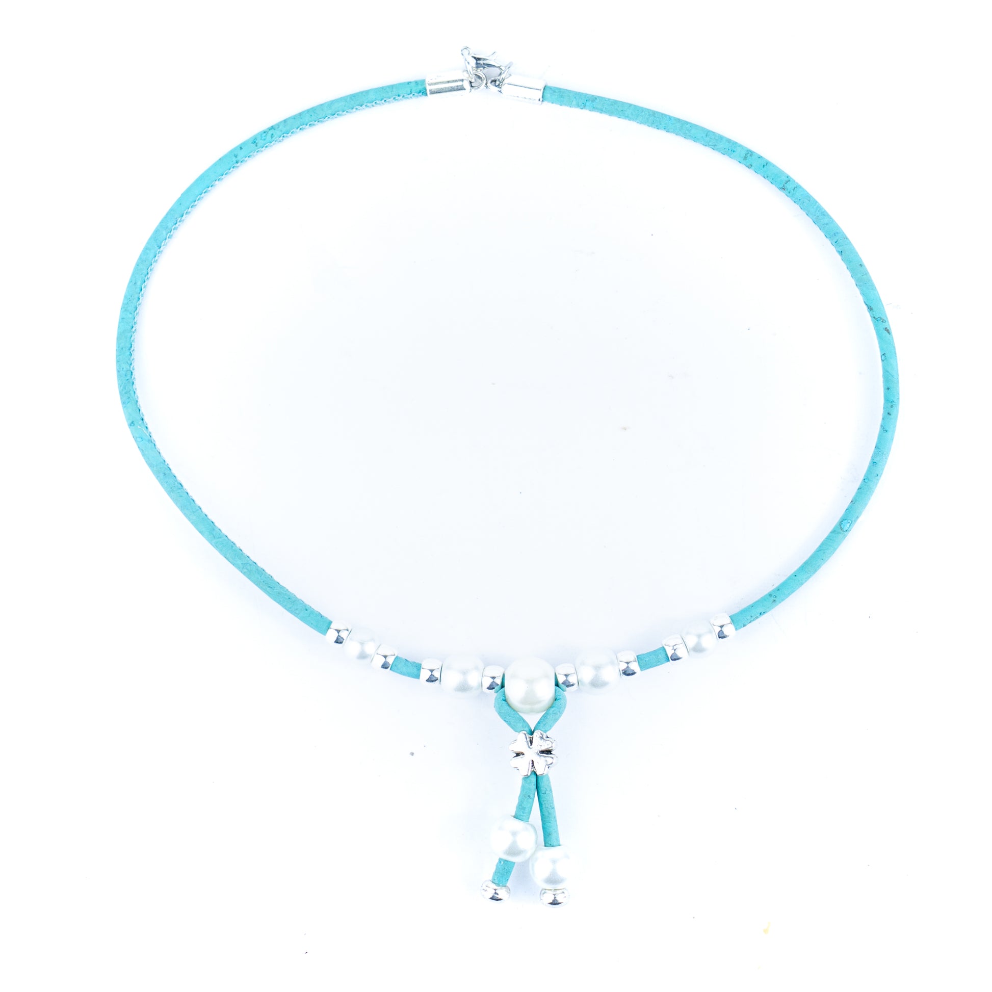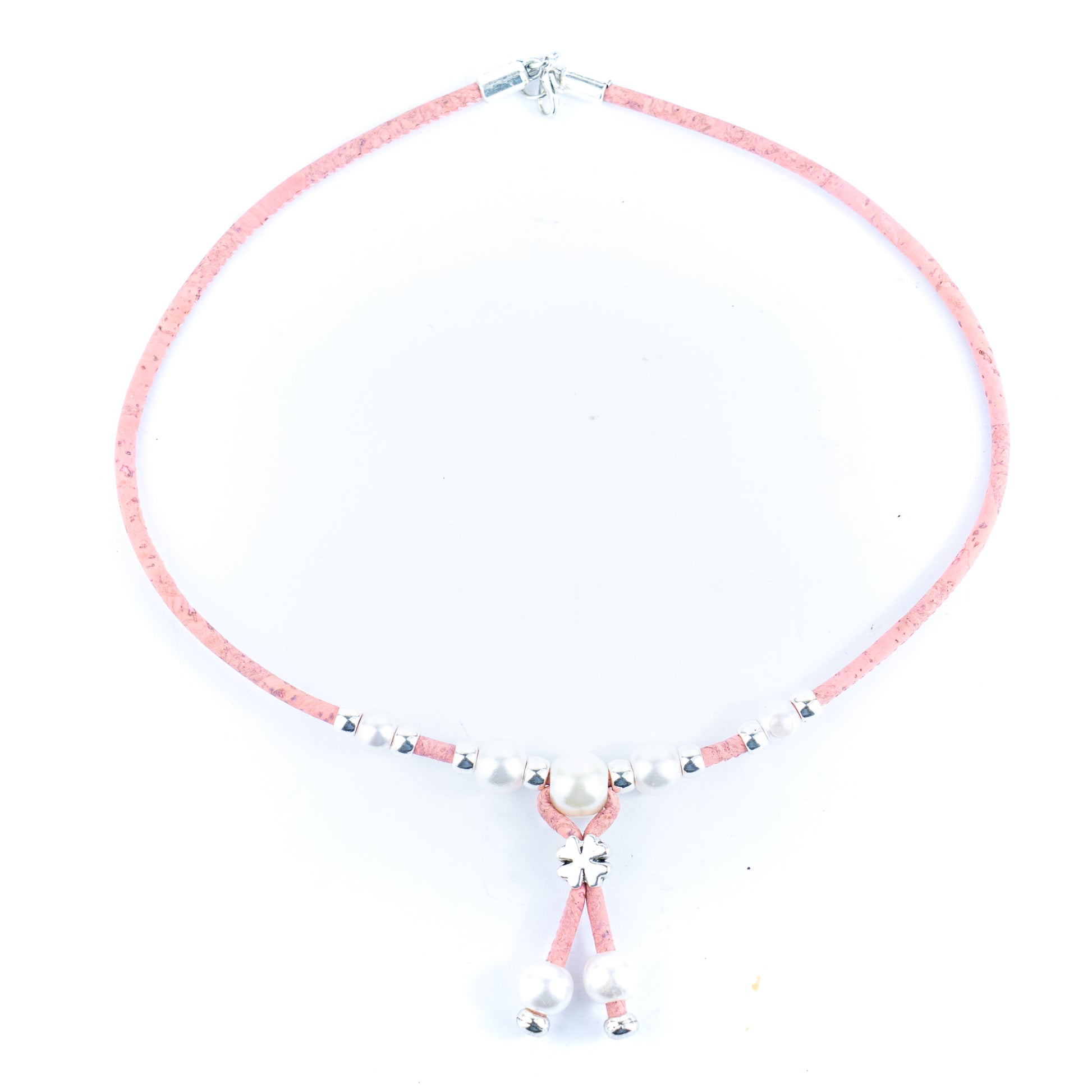 This elegant necklace is handcrafted from 3mm soft colored Portuguese cork cord, decorated with shiny plastic pearls and metal alloy beads. Lightweight, eco-friendly, and vegan, it reflects the beauty of natural materials while maintaining a modern feminine charm.