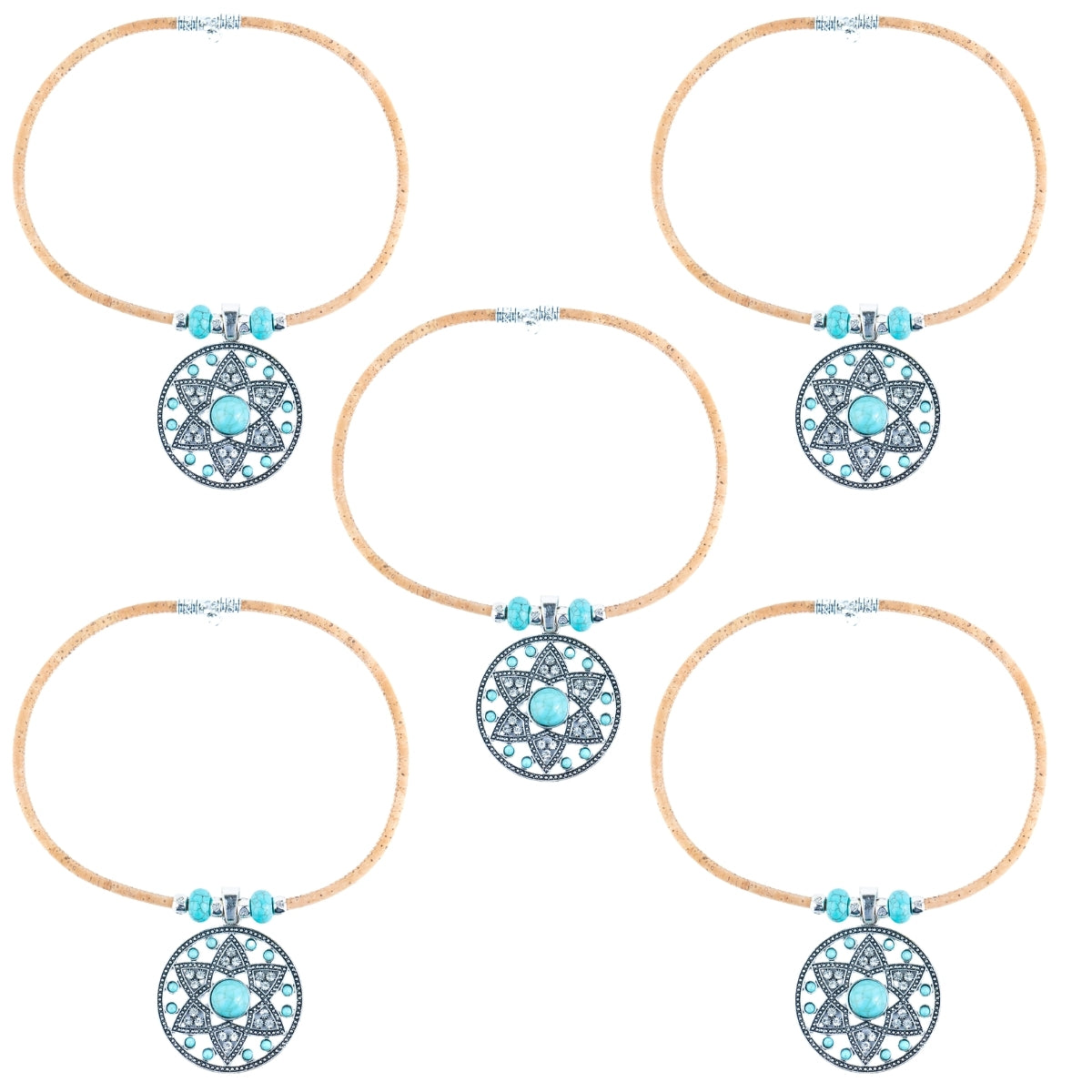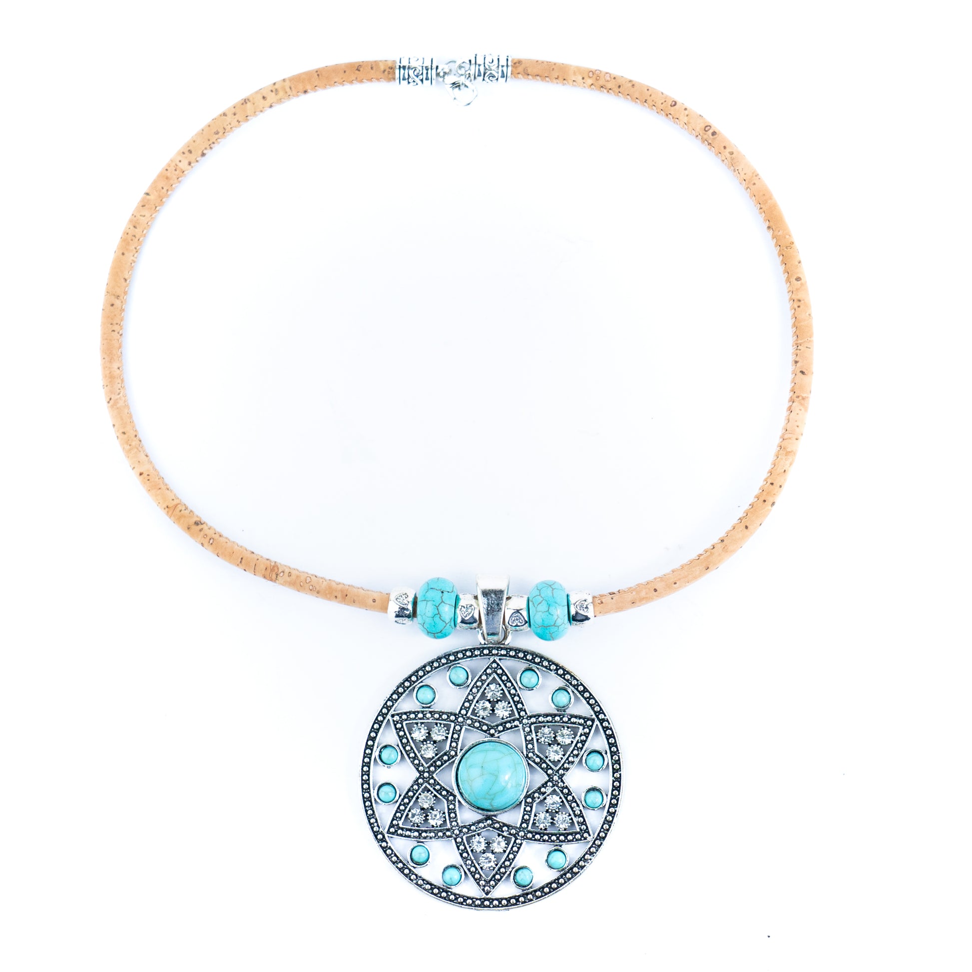Material: Natural cork cord, alloy pendant, resin beads