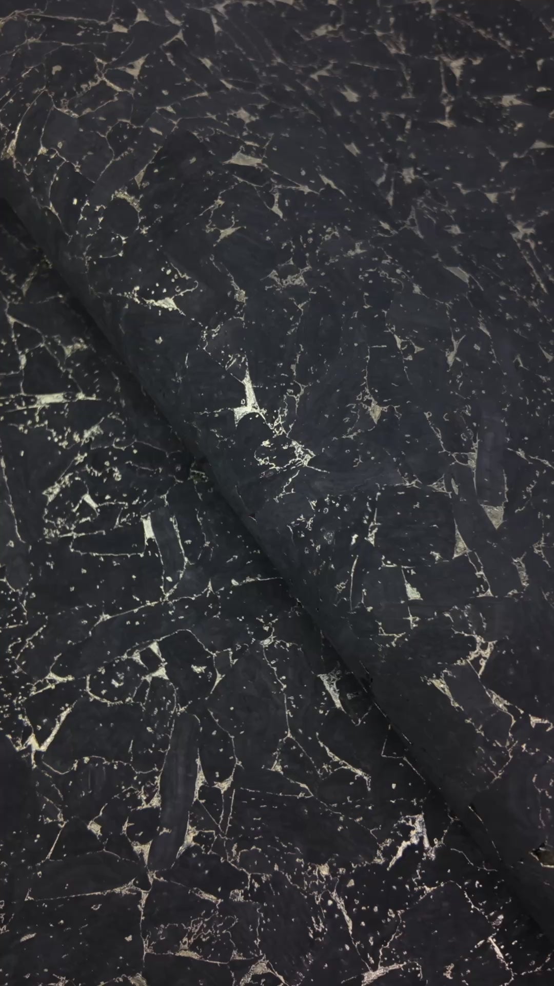 This premium cork fabric features a deep black surface highlighted with elegant gold flecks, creating a luxurious and modern look. Made from natural cork, it is lightweight, flexible, and durable, making it an excellent vegan alternative to leather.