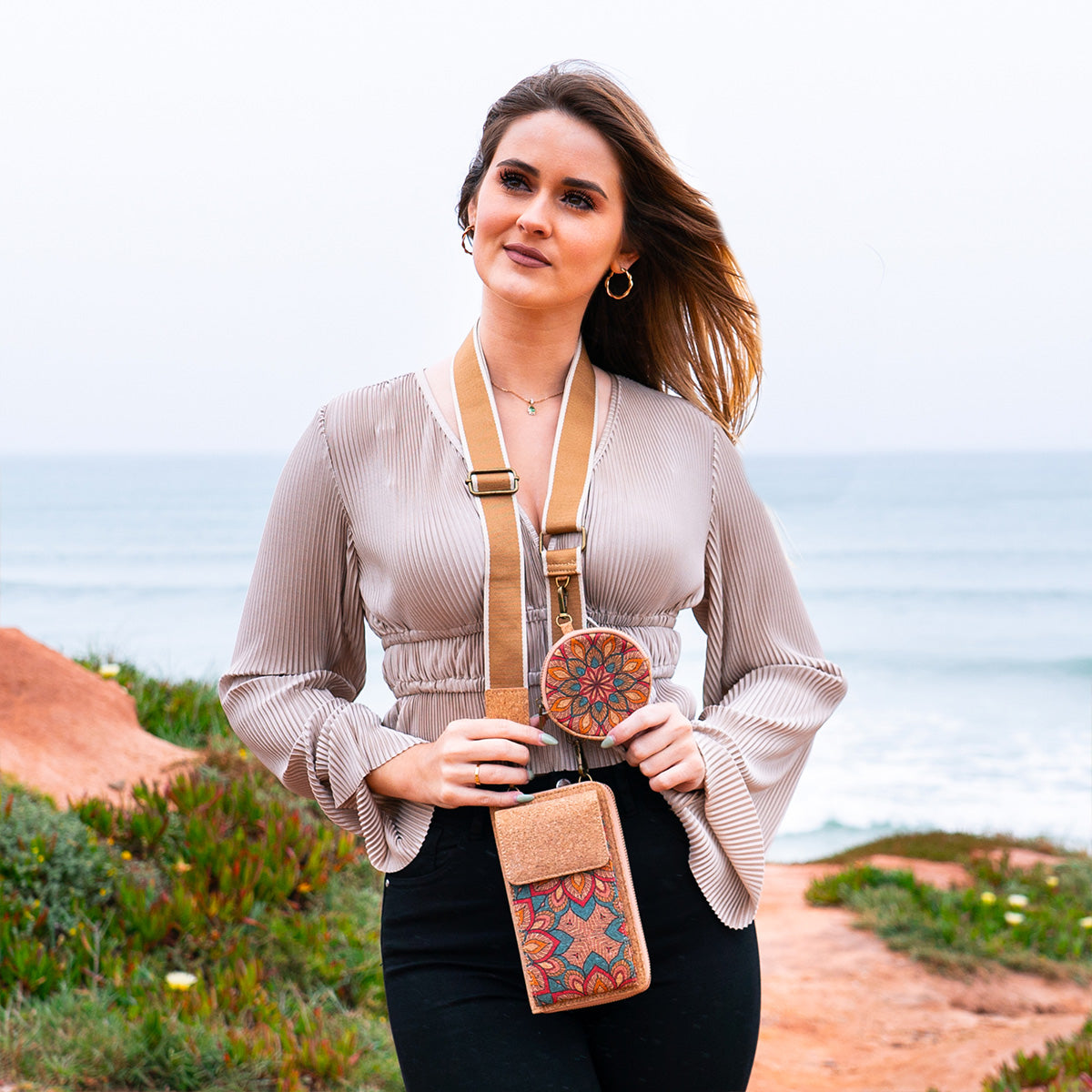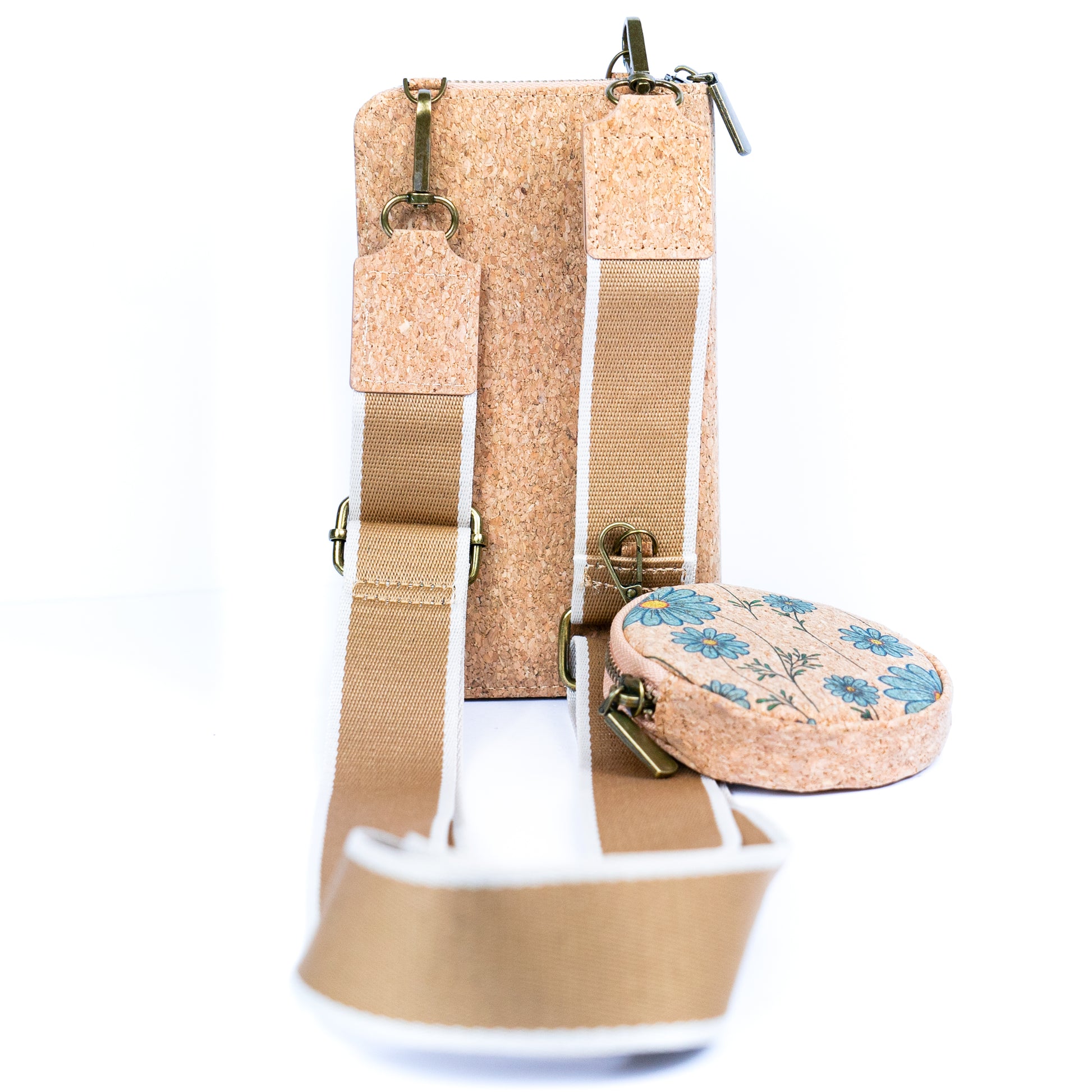 Featuring a wide cotton strap, this pouch offers versatility and comfort. The detachable cotton strap seamlessly blends with the cork material, creating a cohesive look. Additionally, a convenient hook attachment on the strap allows you to hang a mini circular coin purse.