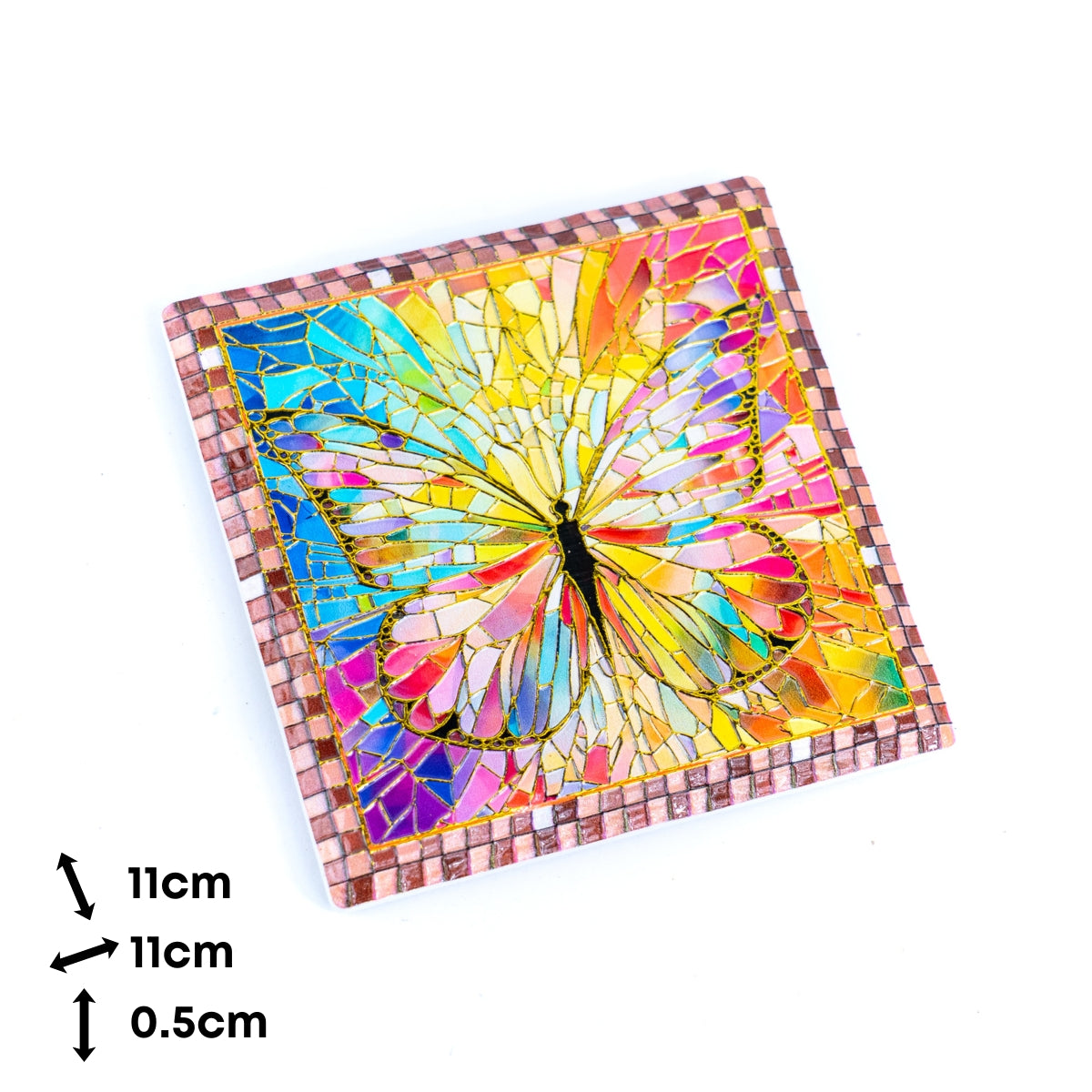 Bring a burst of color and elegance to your table with this Embossed Ceramic Tile Coaster Set featuring beautiful butterfly designs. Each coaster is crafted with a vibrant embossed ceramic surface that feels like mosaic artwork, paired with a natural cork backing to protect your furniture from scratches, heat, and condensation.