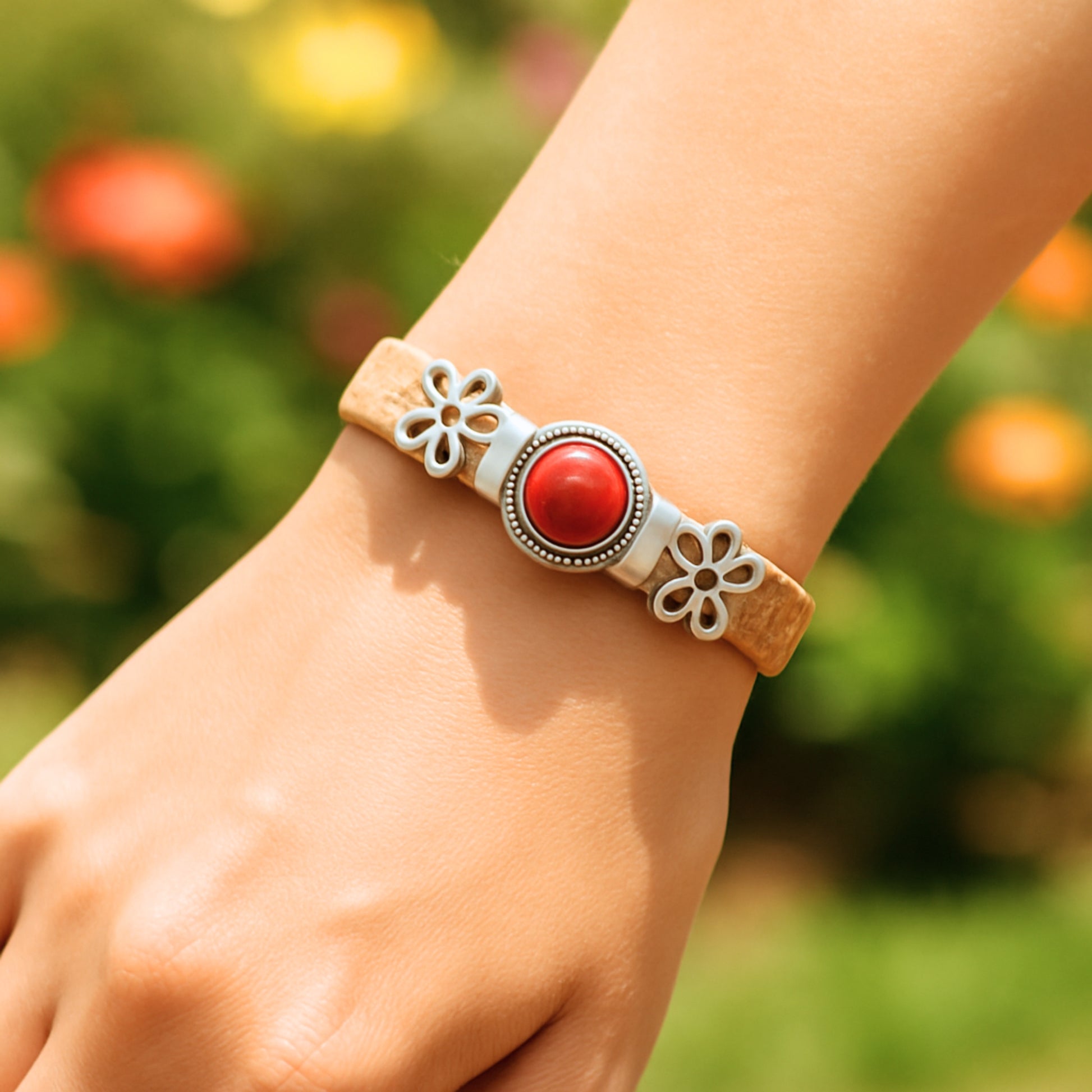 This 10mm thick bracelet, crafted from natural cork, offers a sturdy yet lightweight feel, showcasing a warm, natural texture. The centerpiece features a round simulated turquoise, white-textured stone, or coral-colored stone (please select your color when ordering). The sides are decorated with delicate alloy flower-shaped embellishments and a metal clasp, creating a style that strikes a balance between natural bohemianism and modern minimalism. Each bracelet is hand-assembled, resulting in slight variations in color and texture, ensuring each piece is unique and handcrafted.