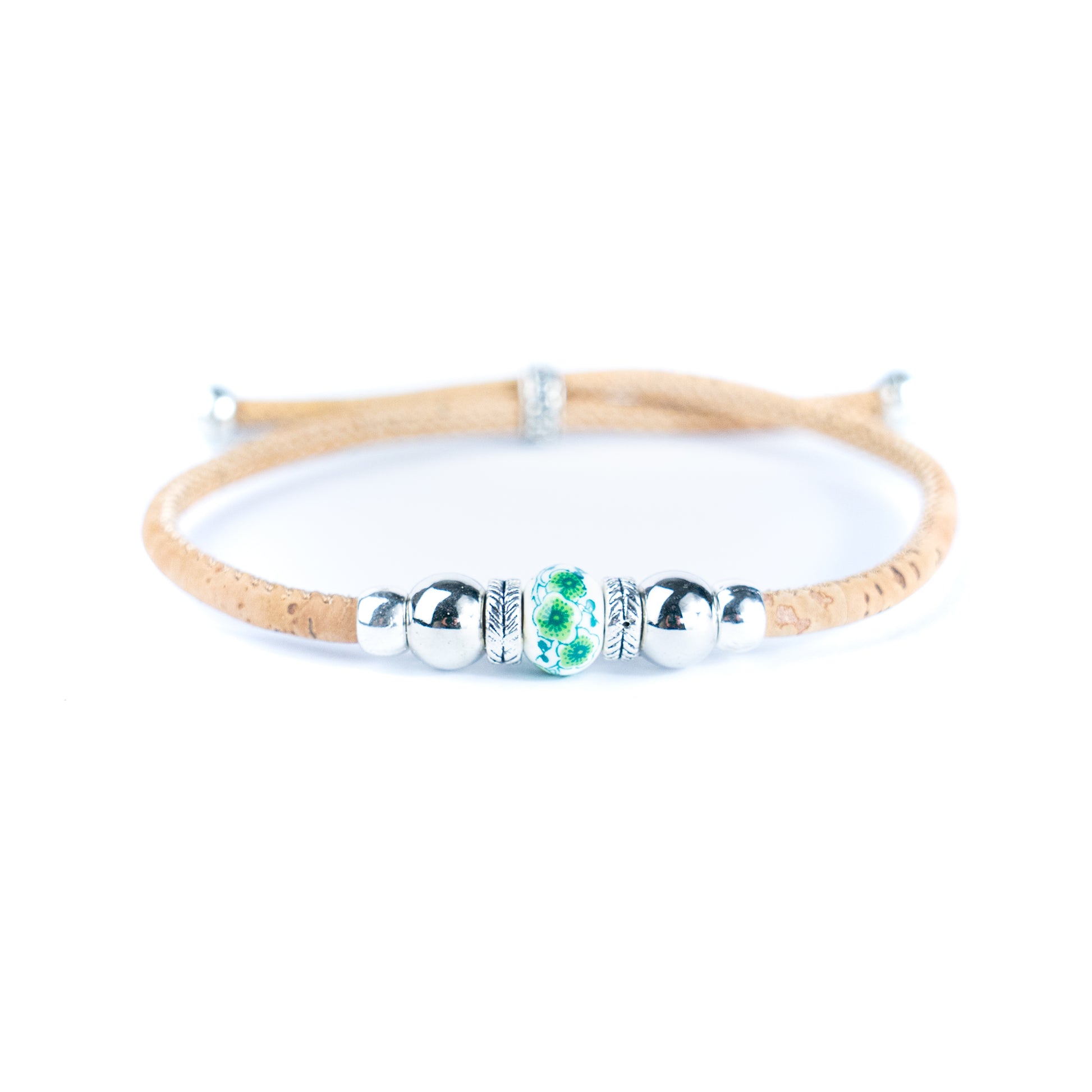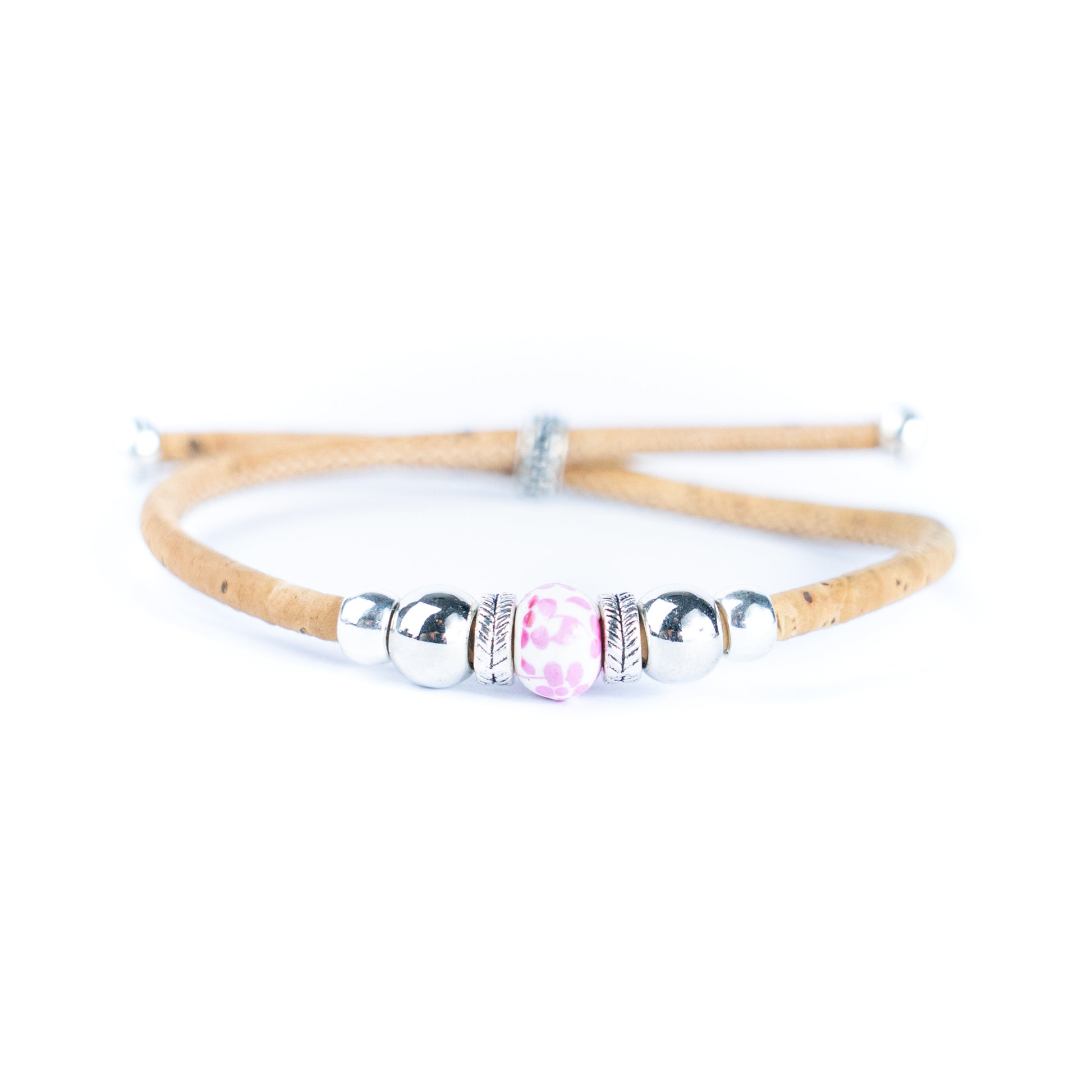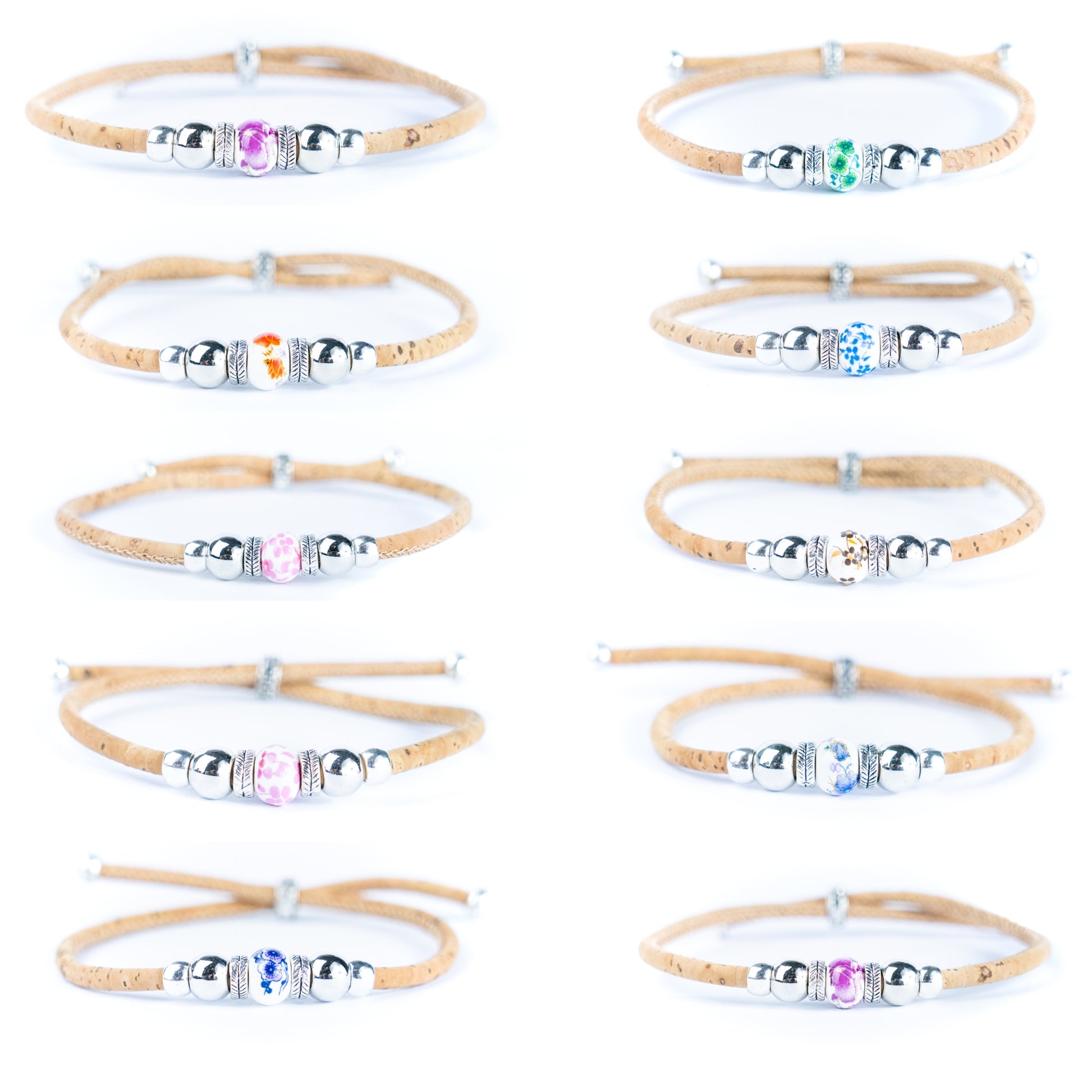 3mm Round Cork Bangle | Ceramic Beads & Alloy Fittings | Handmade, Adjustable | 10 Mixed Colors BR-502-MIX-10